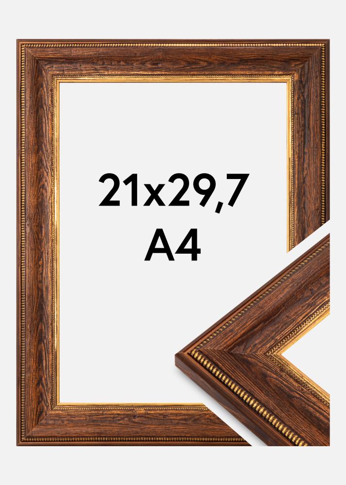Ovaj elegantan okvir za fotografije veličine 21x29,7 cm savršen je spoj rustikalnog šarma i klasične elegancije. Izrađen od visokokvalitetnog drveta, okvir ima duboku smeđu boju s ukrasnim zlatnim detaljima duž unutarnjeg ruba. Drvena struktura je jasno vidljiva i daje topao i prirodan osjećaj, dok zlatne nijanse dodaju sofisticirani dodir koji savršeno pristaje tradicionalnim i vintage nadahnutim interijerima.