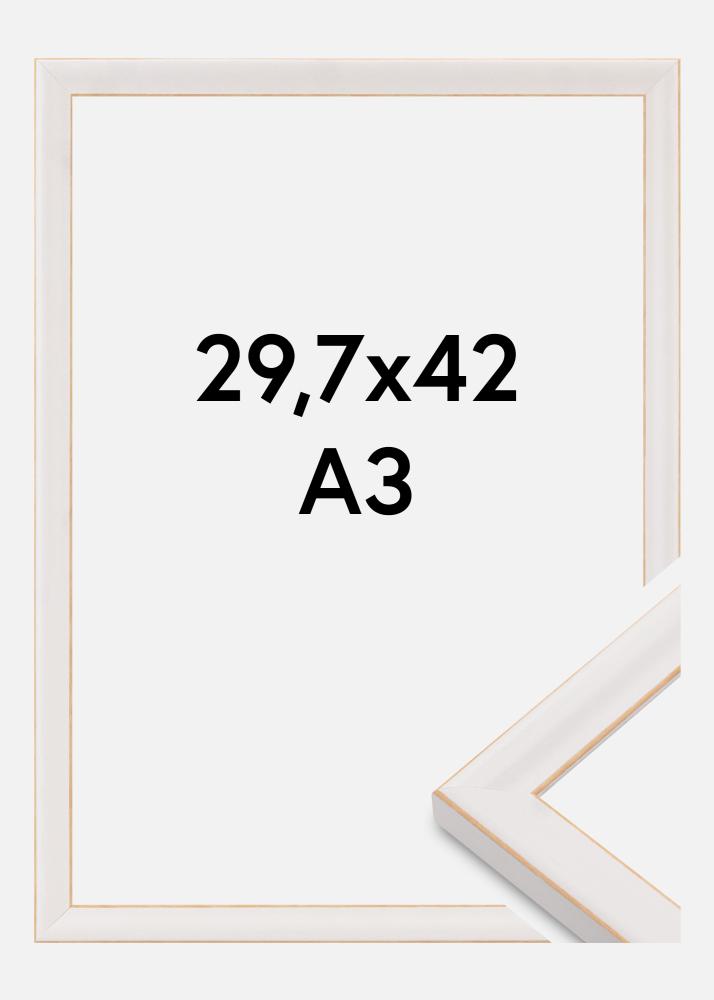Okvir je izrađen od drva i ima 20 mm široku letvicu okvira te dubinu od 16 mm. Fina zlatna detalj duž unutarnjeg ruba uokviruje sliku s ekskluzivnim dojmom. Sa svojom veličinom od 29,7 x 42 cm savršeno odgovara motivima u A3 formatu. Ovaj okvir za fotografije opremljen je metalnim vješalicama na stražnjoj strani, što ga čini jednostavnim za objesiti i horizontalno i vertikalno, ovisno o vašim potrebama.