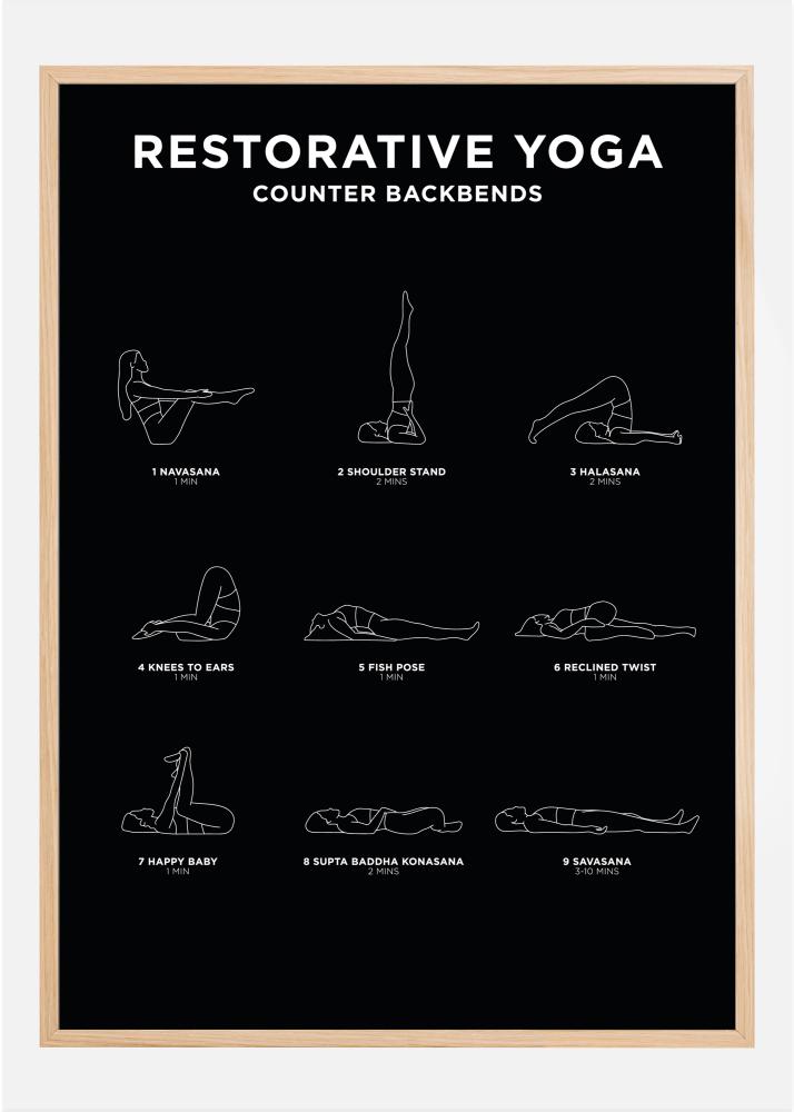 Naučite se opustiti uz Restorative yogu. Ovaj elegantan poster nije samo lijep ukras, već vam također pruža konkretne upute za pozicije unutar ovog opuštajućeg stila joge.