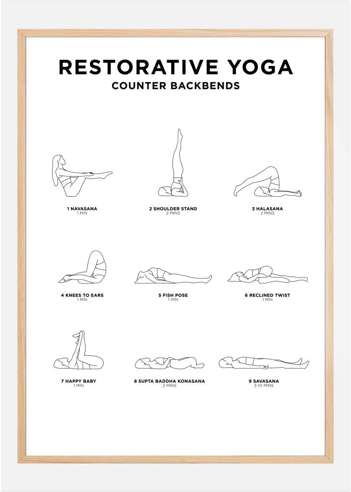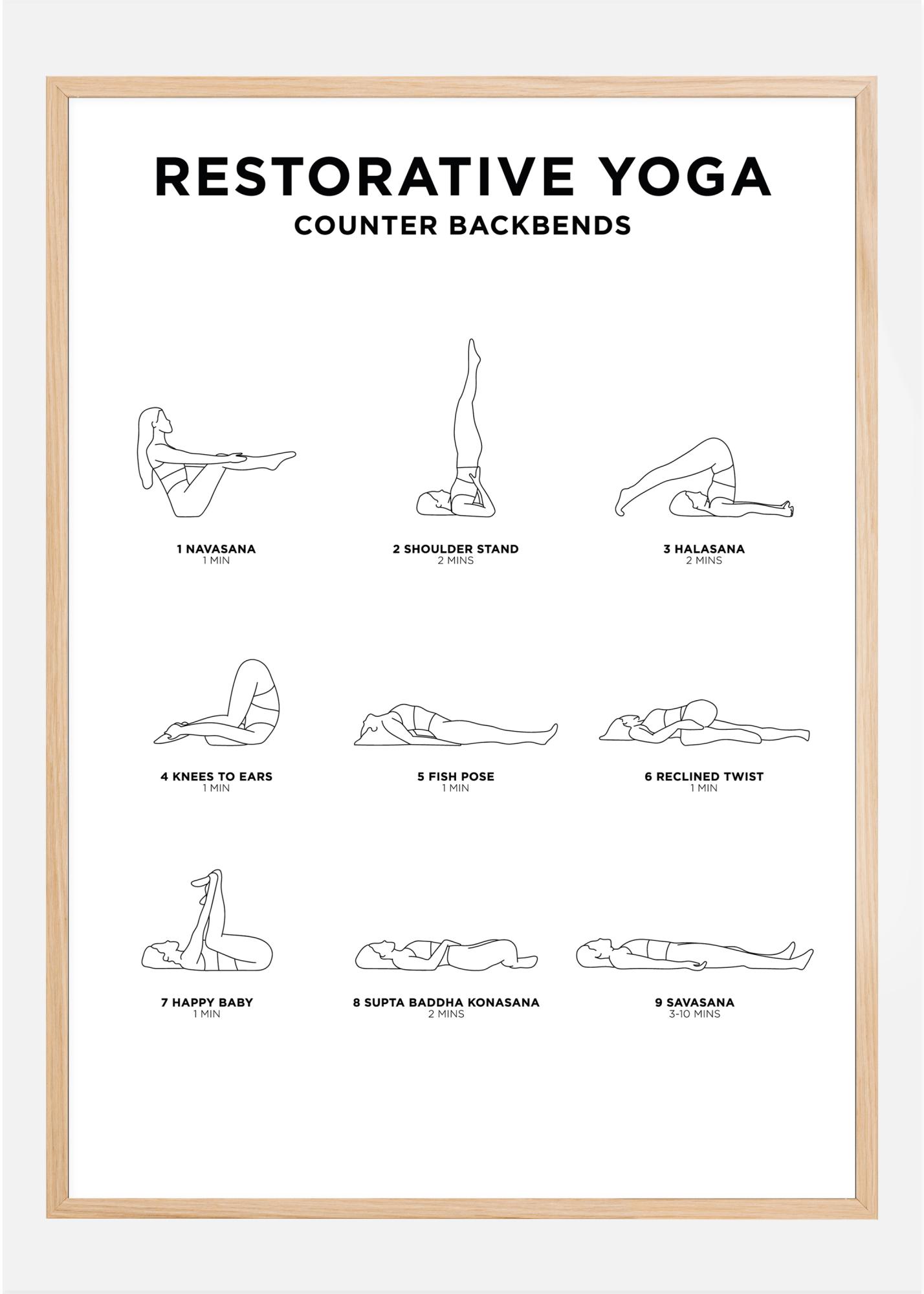 Naučite se opustiti s Restorativnom jogom. Ovaj stilizirani poster nije samo lijep dodatak za uređenje interijera, već vam također daje konkretne upute za pozicije u ovom opuštajućem stilu joge.
