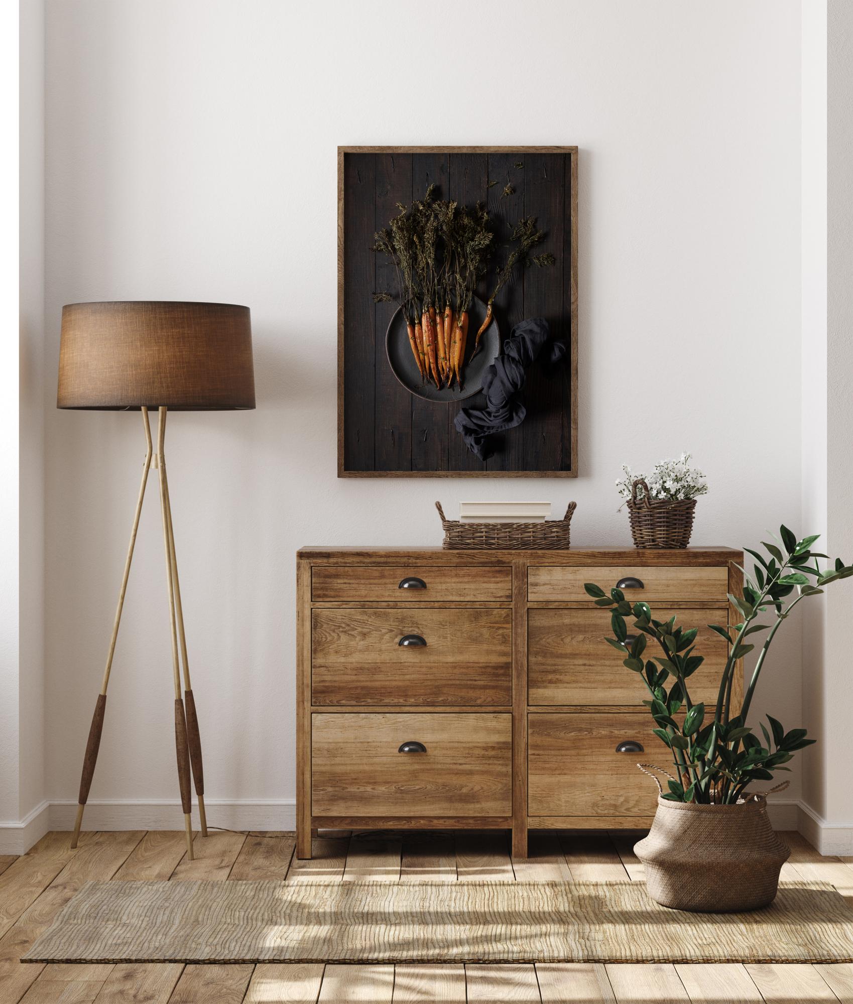 Kulinarski poster s hrpom svježe ubranih mrkvi koje leže na tamnoplavom tanjuru. Narančaste mrkve prilično sjaje dok leže na tamnoplavom tanjuru s tamnim drvom u pozadini. Venuli listovi ukazuju na to da su ove mrkve spremne za jelo. Dodajte ovo u svoju kuhinju za zabavnu foodie atmosferu.