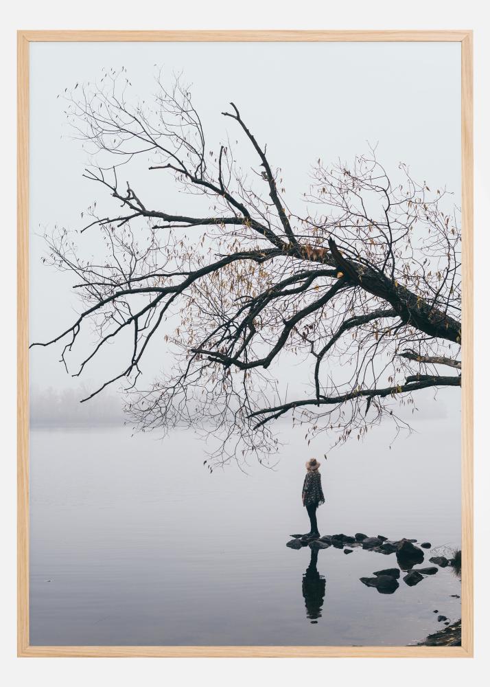 Poster s pogledom na more žene koja stoji na malom kamenitom molu u jezeru dok se drvo nadvija nad njom. Bijelo jezero odgovara nebu iste boje. Žena se ističe u kontrastu dok gleda preko vode u mirnoj kontemplaciji. Unesite mir u svoj dom s ovom slikom iz prirode.