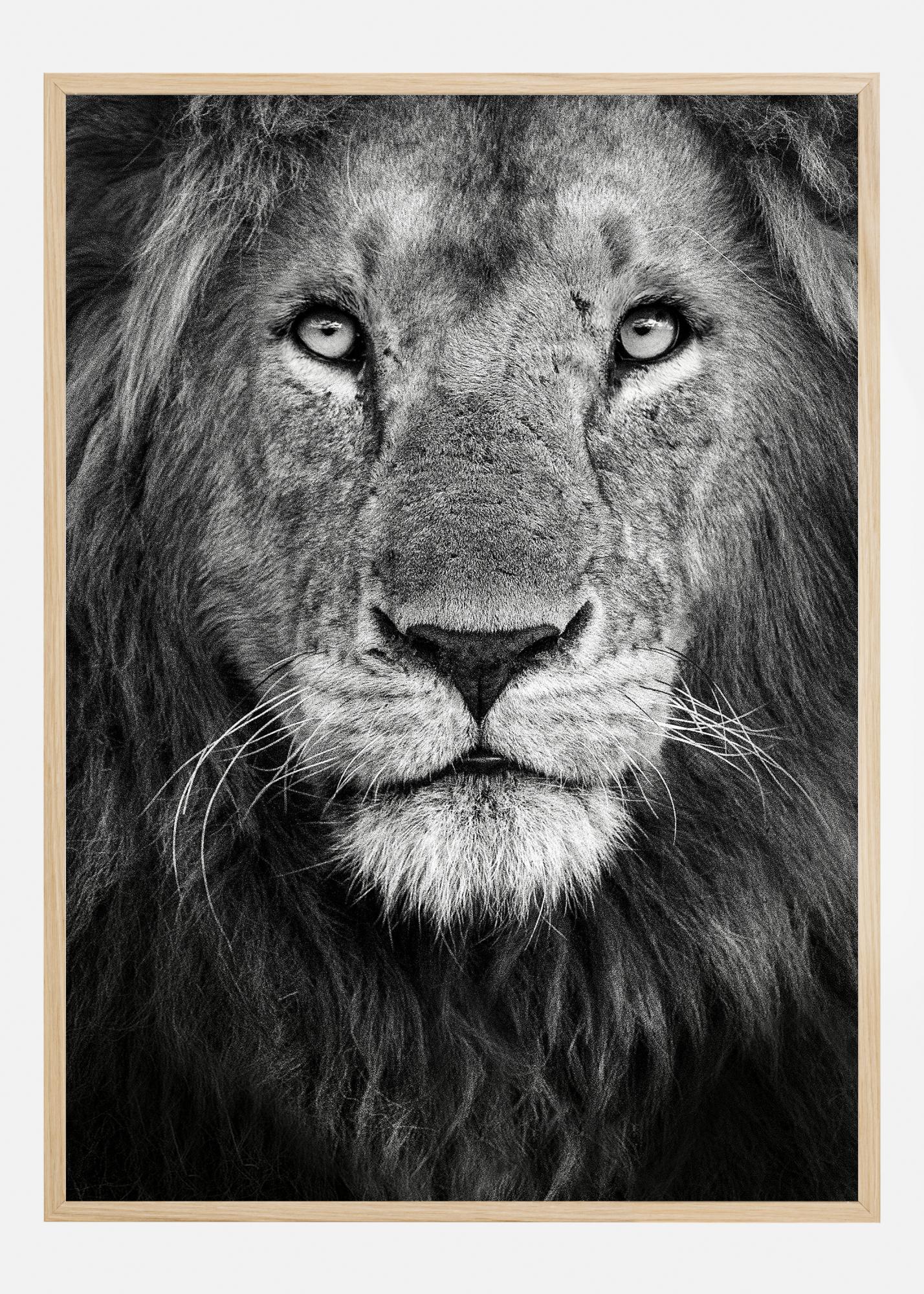 Ovaj snažan i izražajan poster prikazuje portret mužjaka lava u krupnom planu u crno-bijeloj boji, hvatajuÄi životinjsku veliÄanstvenu prisutnost i divlju esenciju. Intenzivan pogled lava, njegova gusta griva i svaka pojedinaÄna brk dolaze do izražaja zahvaljujuÄi visokom kontrastu i bogatstvu detalja na fotografiji. Ovo je motiv koji odmah privlaÄi pažnju i stvara dubok i trajan dojam.