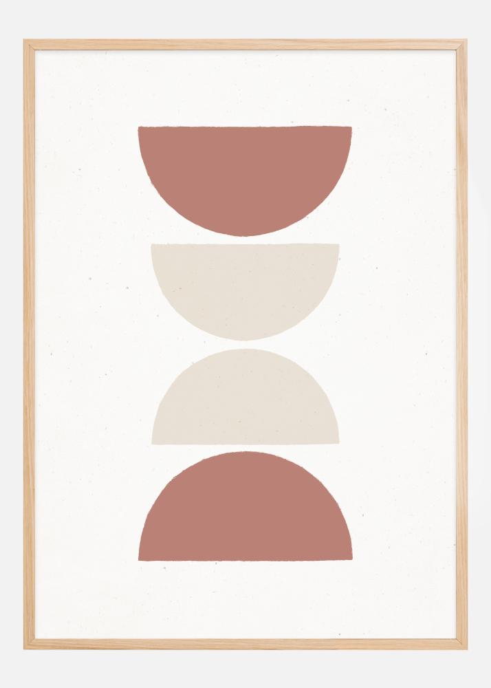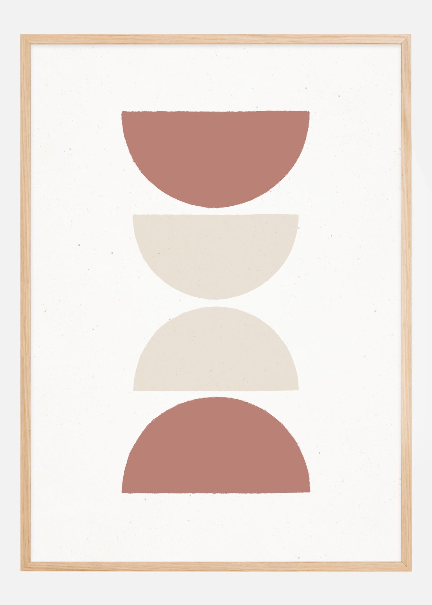 Ovaj sofisticirani poster, nazvan 'Rust and Sand - Lungo', privlači pažnju svojim jednostavnim, ali smjelim rasporedom polukružnih oblika. Oni su složeni jedan na drugi u umirujućoj simetriji, stvarajući vertikalnu dinamiku na bijeloj pozadini. Sa svojom diskretnom paletom hrđavo crvene i pješčano bež boje, ovaj print je oda uzvišenoj jednostavnosti i unosi topao i prizeman osjećaj u svaki prostor u kojem je postavljen.