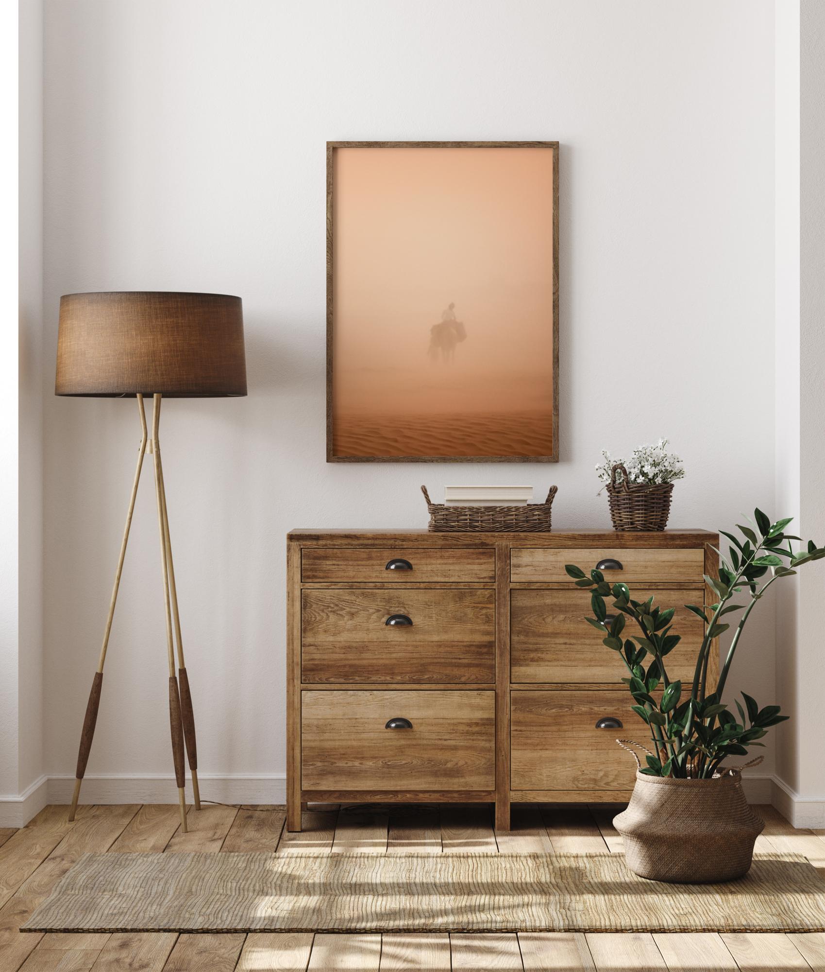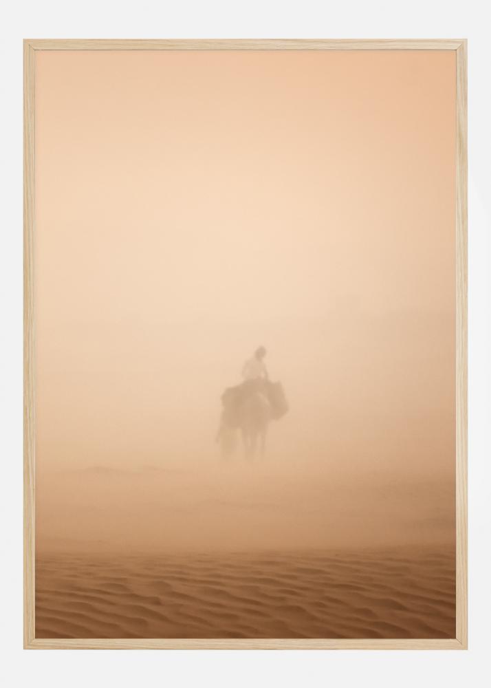 Topao poster s pješčanom olujom. Pustinjskim pijeskom može se vidjeti u prvom planu prije nego što nestane u vrtložnom oblaku mekih boja. U sredini se nazire slaba forma lika koji jaše i bori se u oluji. Osjetite toplinu pustinje.