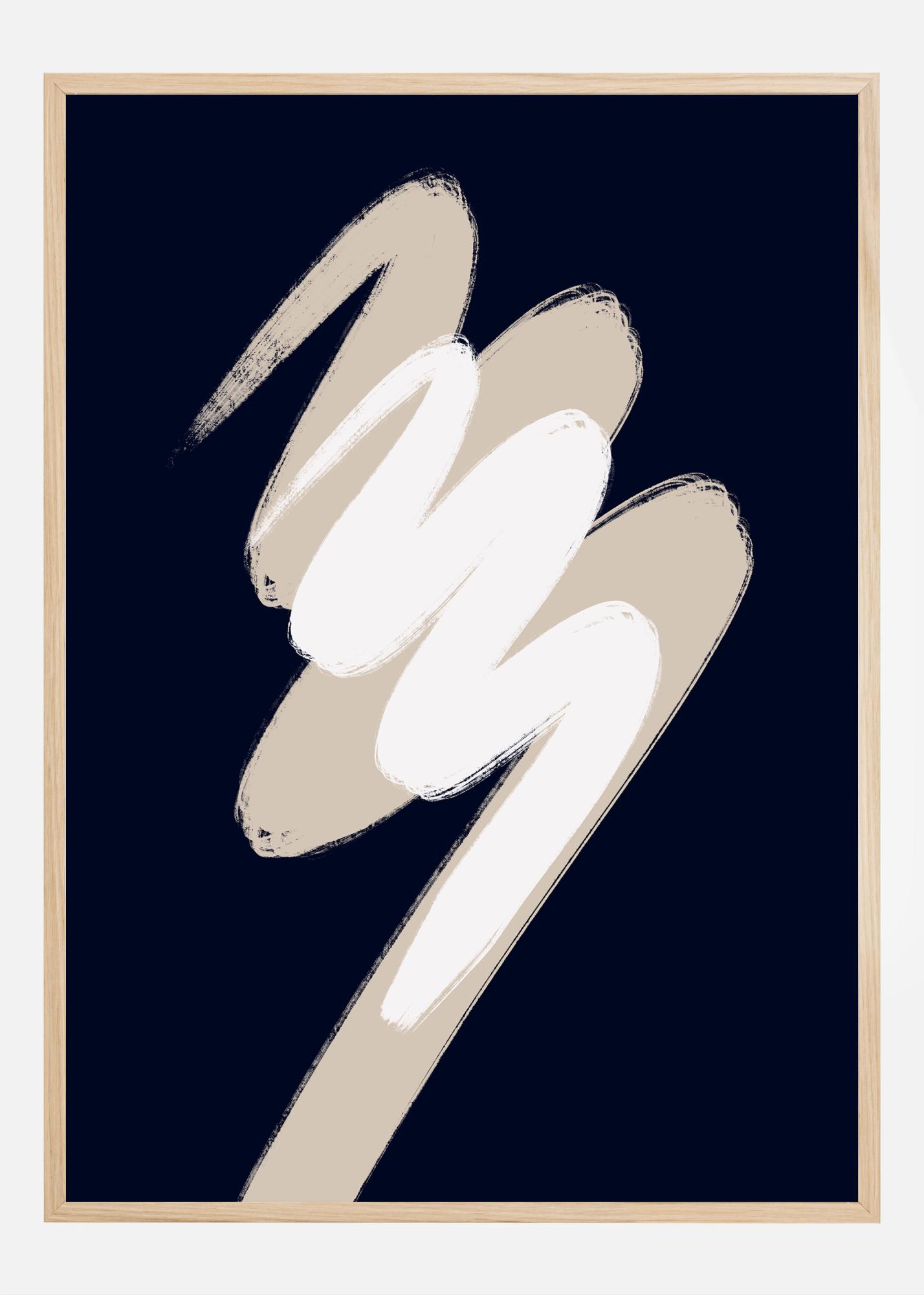 Ovaj apstraktni i moderni poster odiše osjećajem umjetničke slobode i kreativnosti. Smjele poteze kistom u bijeloj i bež boji prelaze preko tamnoplave pozadine, čime se stvara snažan vizualni kontrast koji privlači i zadržava pozornost promatrača. Motiv ostavlja dojam kretanja i spontanosti, što je karakteristično za ekspresivni pravac unutar apstraktne umjetnosti.