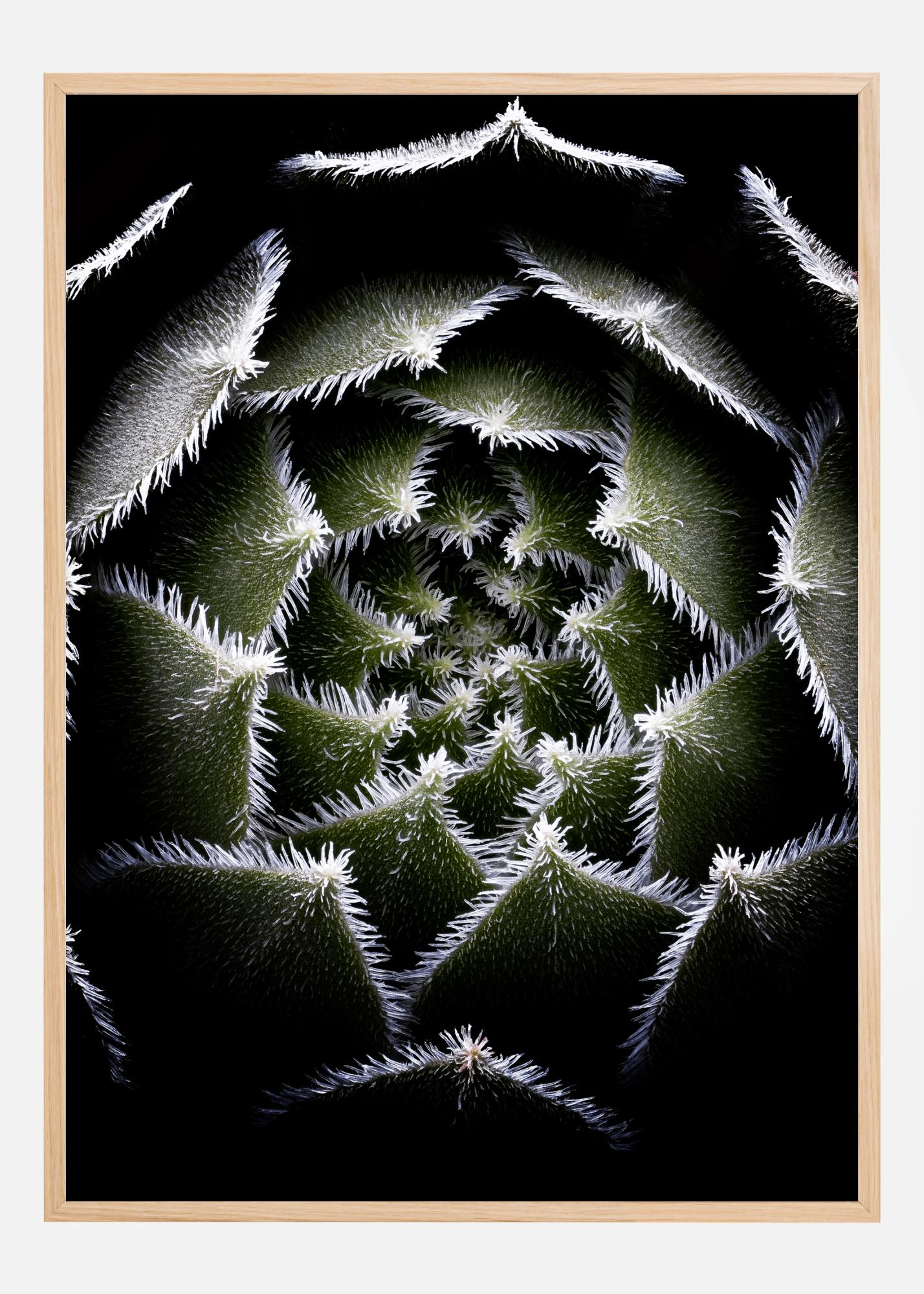 Makrofotografija rozete biljke sempervivum. Na ovoj fotografiji iz blizine prikazana je rozeta duboko zelenih listova, pri čemu je svaki od njih ukrašen malim bijelim bodljama. Detalji su nevjerojatni i svi će se zaustaviti kod ovog prekrasnog postera.