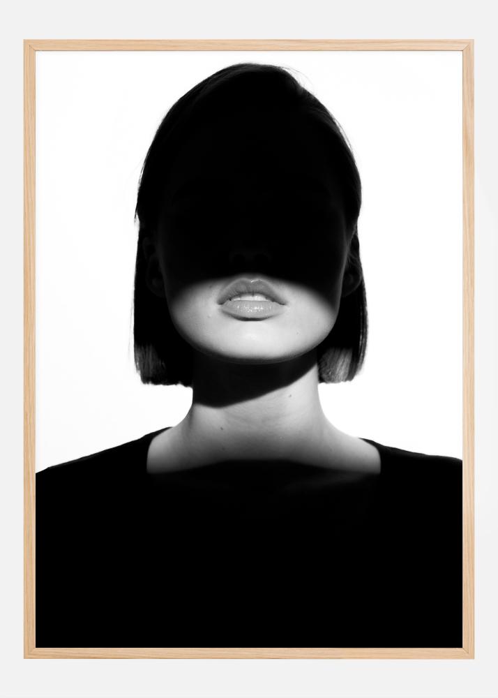 Ovaj upečatljivi poster hvata snažnu sliku žene čije su oči skrivene tamnom sjenom, što daje tajanstven i misaon učinak. Oštar kontrast između bijelih naglasaka i dubokih crnih tonova naglašava njezine izražene usne i skulpturalne crte lica. To je slika koja balansira na granici između vidljivosti i anonimnosti, svjetla i tame, i privlači promatrača da traži dublja značenja.