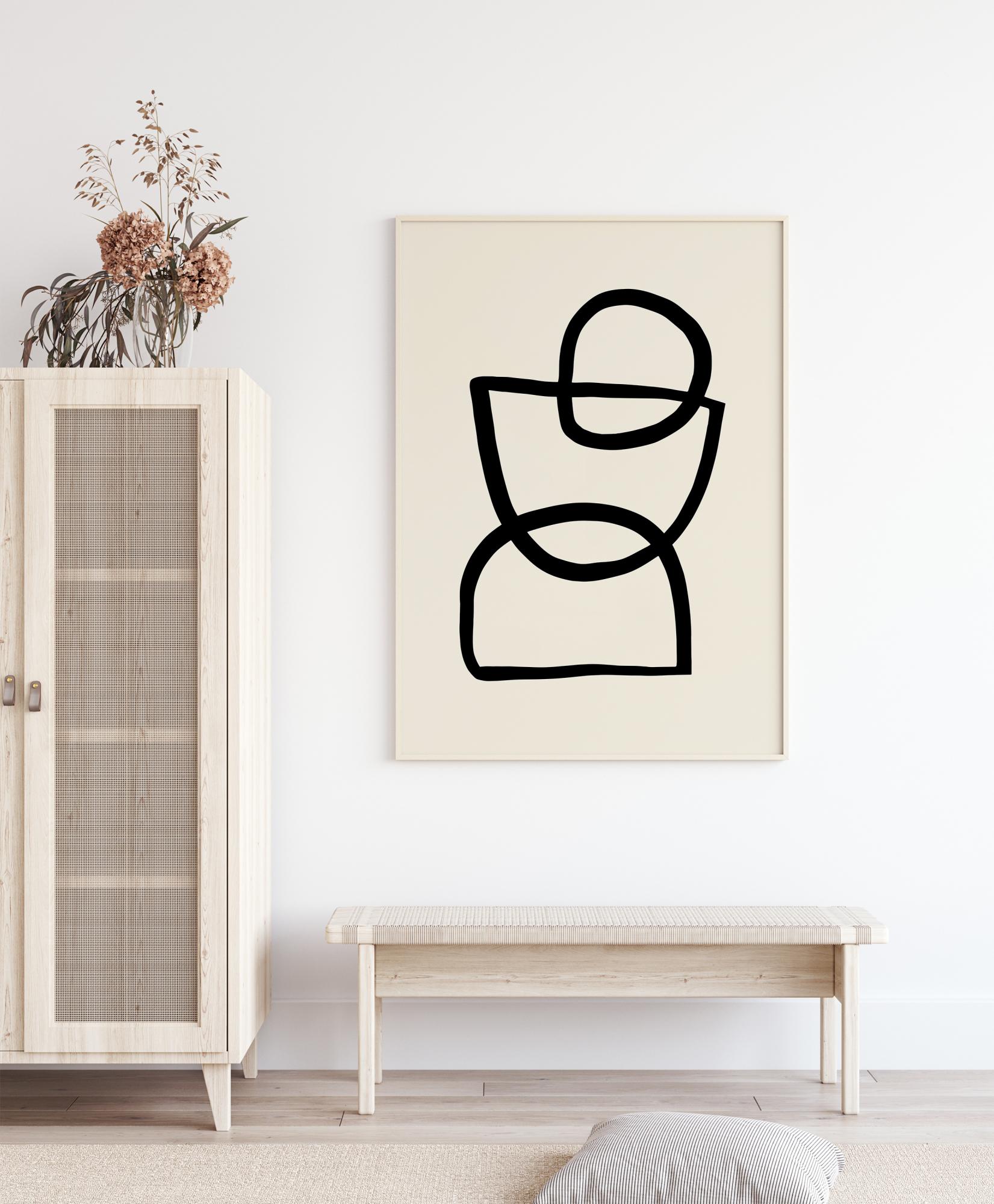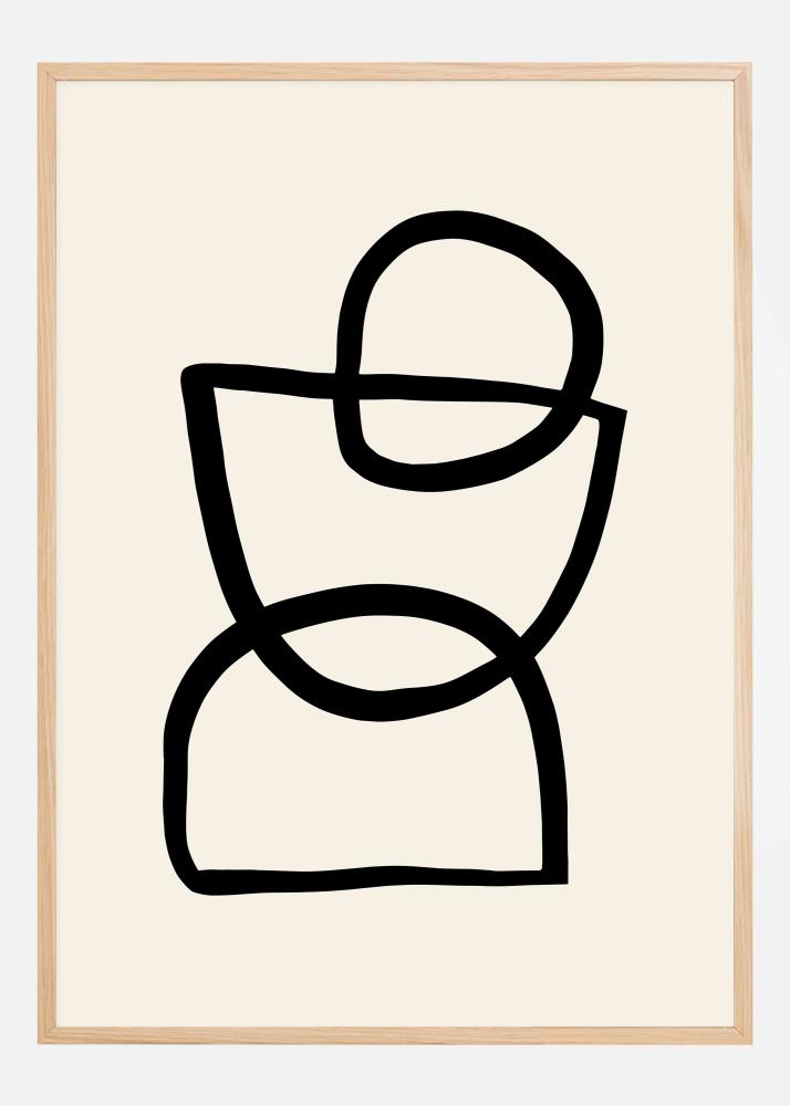Zabavan apstraktni poster s tri različita oblika, od kojih je svaki nacrtan debelom crnom linijom. Postoje dva polukruga i jedan puni krug na vrhu. Oni se preklapaju kako bi stvorili apstraktni dizajn. Objesite ga kod kuće i interpretirajte sliku baš kako želite. Je li to osoba, stalak za jaja ili pješčani sat? Ovisi o vama.