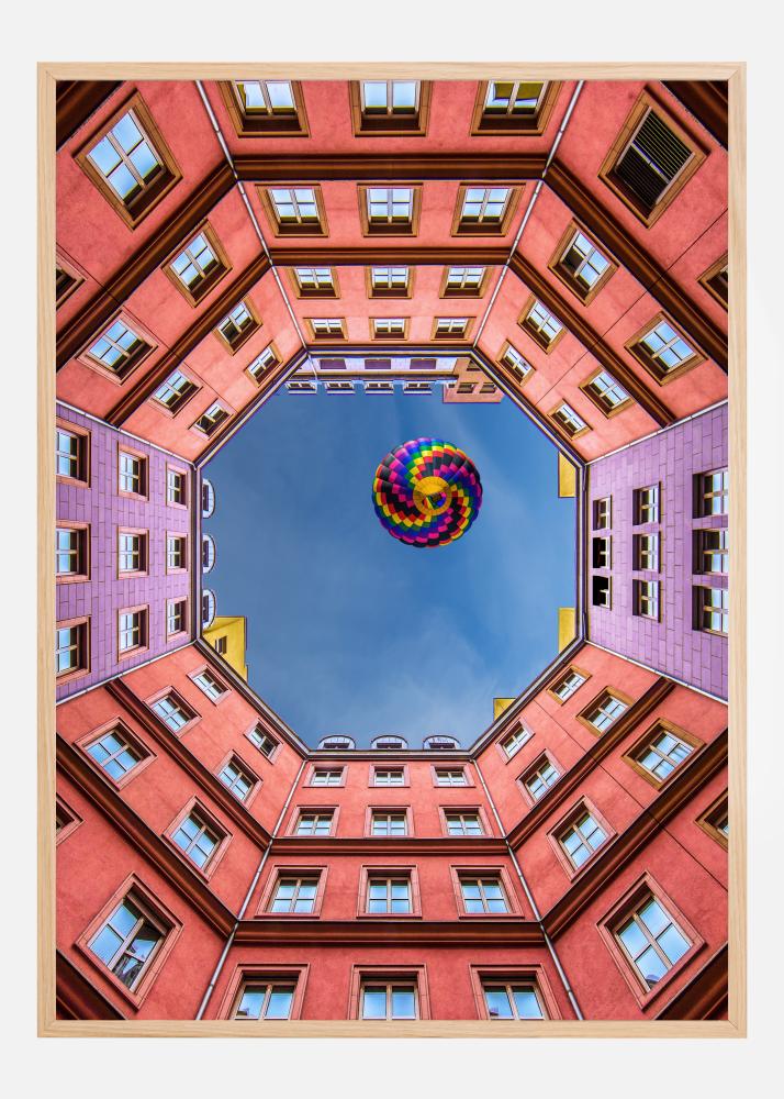 Sjajan poster iz žablje perspektive kroz ružičaste zgrade prema vedrom plavom nebu. Zgrade tvore šesterokut dok gledate gore preko svih prozora. U sredini plavog neba nalazi se balon u bojama duge koji lebdi iznad otvora. Neka vas ova svijetla, optimistična slika odvede u svijet mašte.