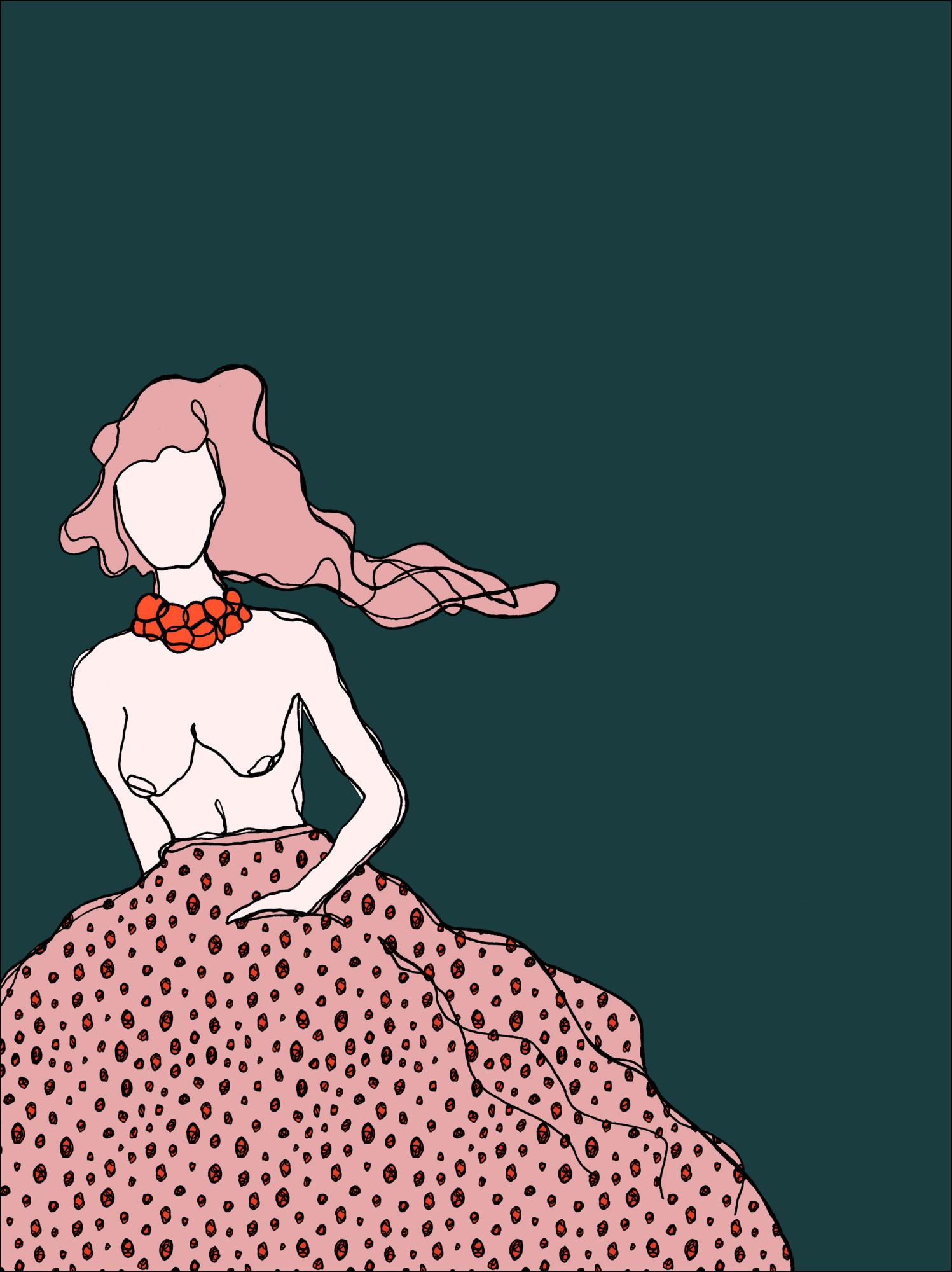 Zabavan poster s djevojkom na zelenoj pozadini. Žena je u toplesu s ružičastom suknjom s velikim mrljama, koja vijori van. Njezina ružičasto-crvena kosa leprša postrance na nevidljivom povjetarcu. Svijetlo narančaste perle krase njen vrat. S jednom rukom u džepu, ovaj crtež žene u pokretu daje opušten osjećaj, savršen za ležerno cool zidno uokvirivanje.