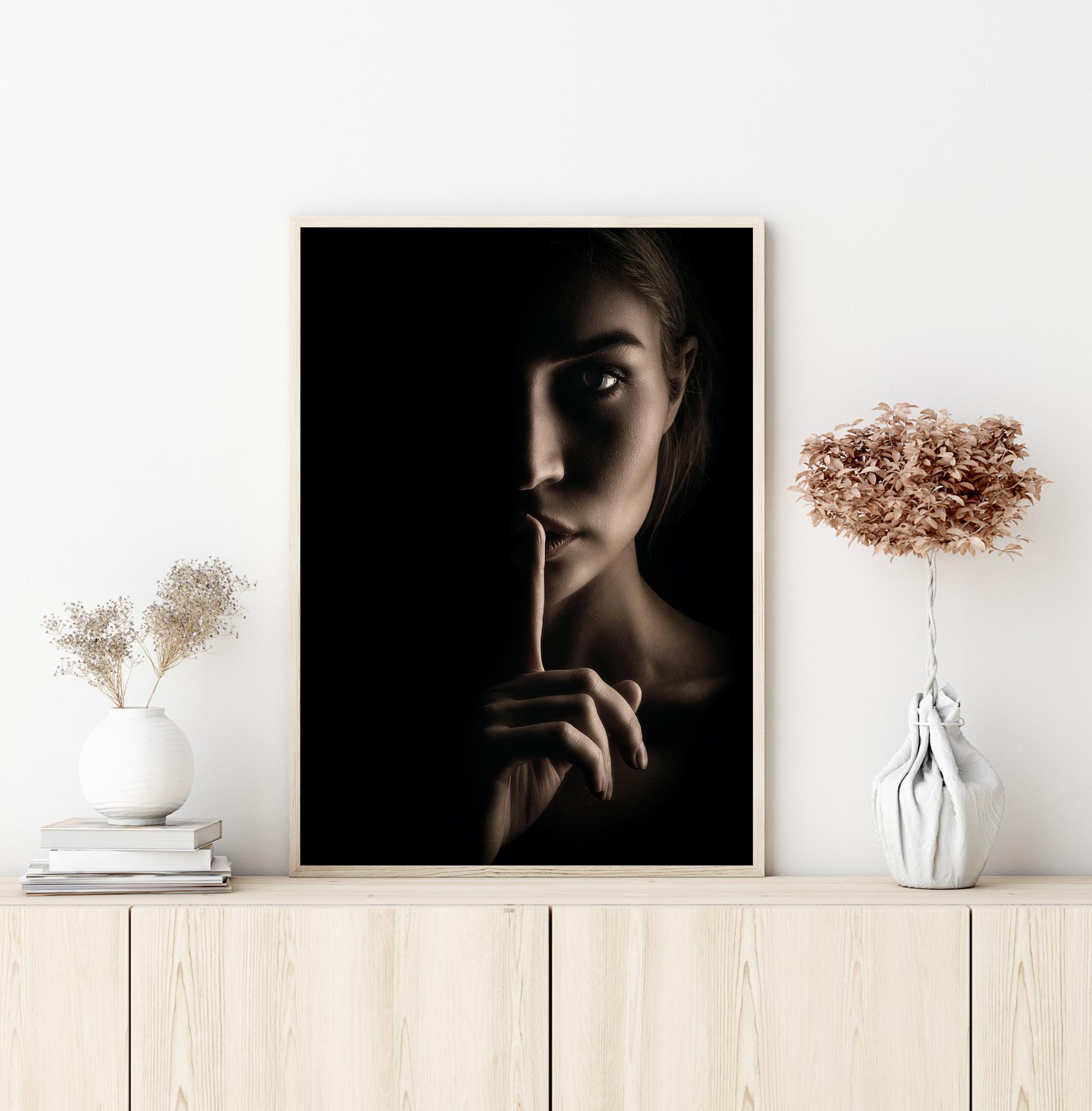 Mistični portretni poster s licem žene napola u sjeni. Prst je podignut do njezinih usana kako bi vas držala tihim dok vas gleda izravno u oči. Dramatično osvjetljenje stvara blag sjaj s jedne strane, dok ona pada u sjenu s druge strane.