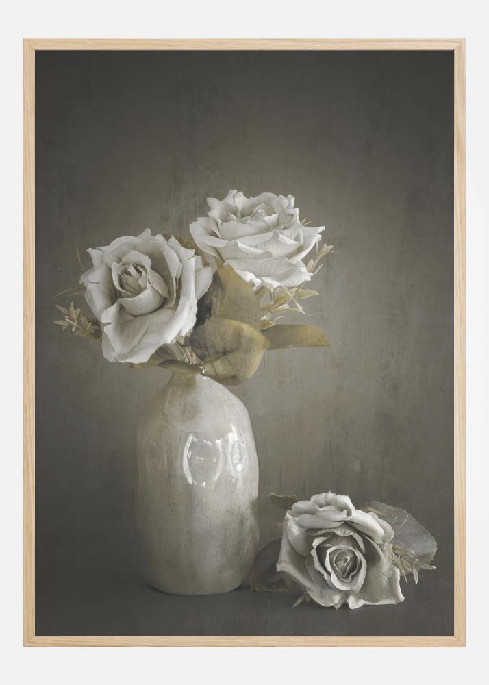 Jednostavan poster s oslikanim ružama u vazi. Dvije bijele ruže stoje u bijeloj vazi, treća ruža je smještena na polici pored. Svaka ruža sjaji s nevidljivom svjetlošću prema mekoj, tamnosivoj pozadini, što stvara elegantnu, ali ipak teatralnu sliku.