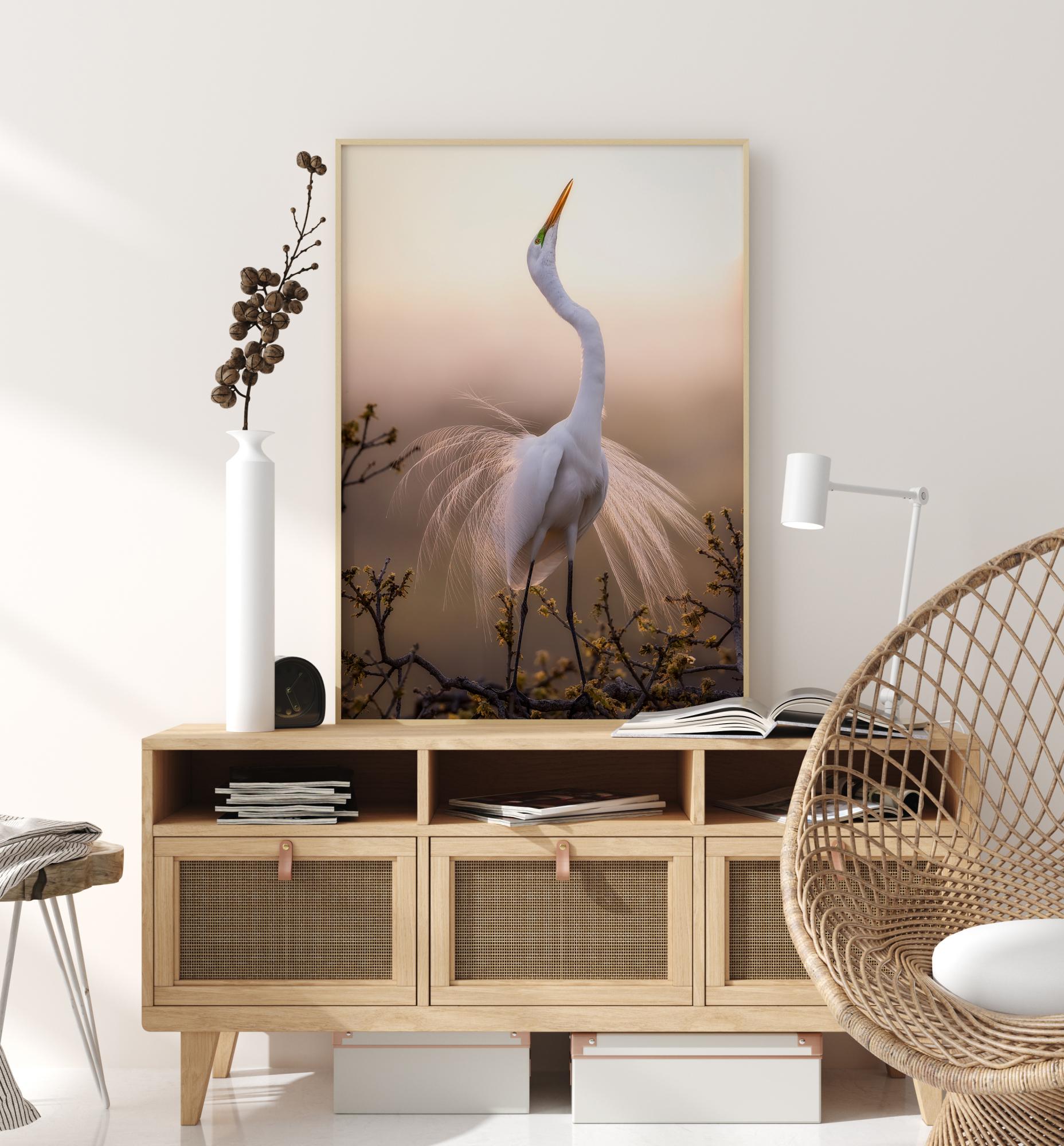 Plakat sa životinjama s rodama koje plešu na jutarnjem svjetlu. Veličanstveno bijelo tijelo rode naspram nježne zalaske sunca koja svijetli kroz perje stvara nestvarnu scenu. Probudite se svako jutro s osjećajem čuđenja uz pomoć ovog otiska.