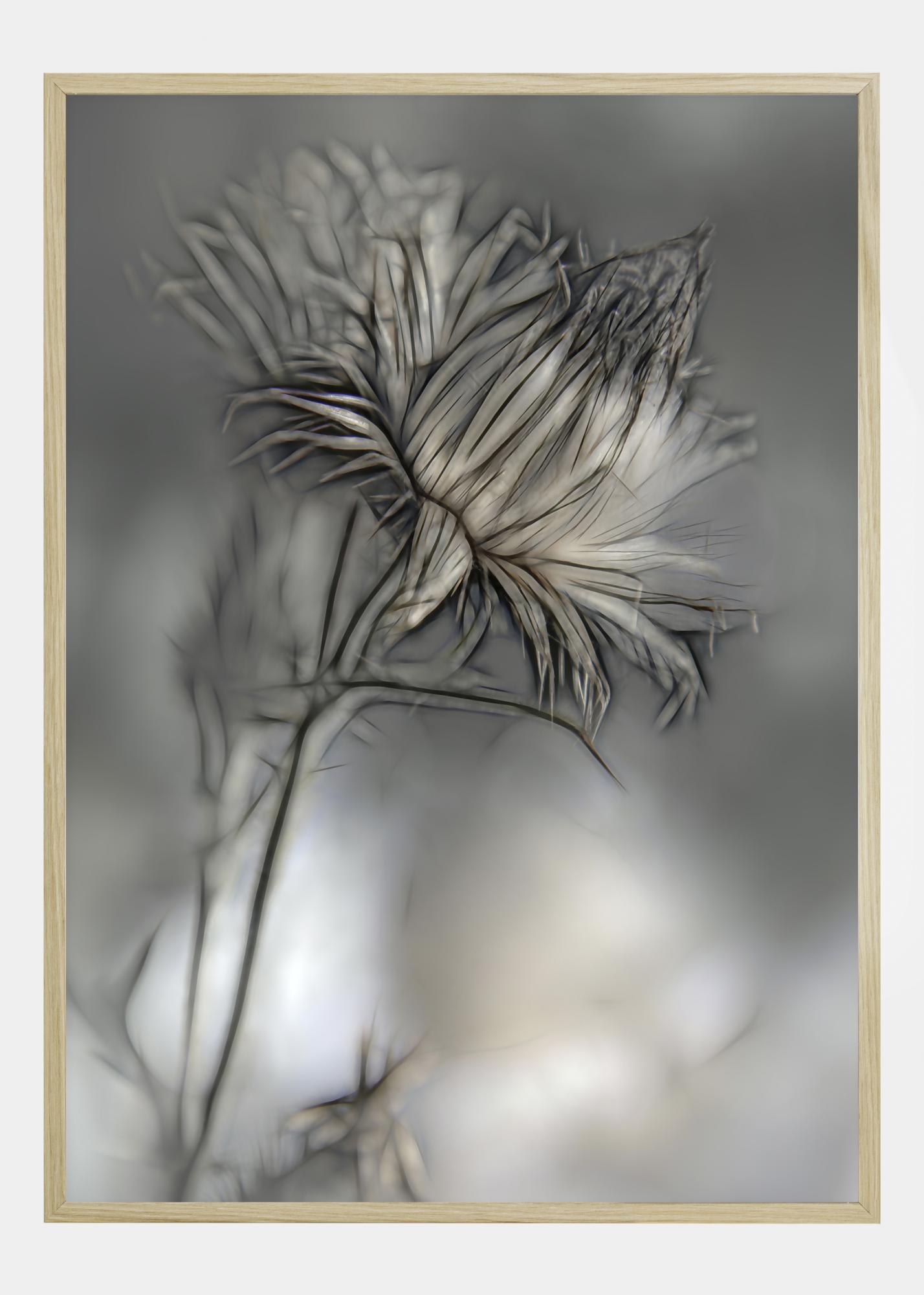 Poster izbliza s cvjetnom glavom. Mekane plave, sive i ružičaste boje ispunjavaju sliku dok je cvijet jasno odvojen od nježne, zamućene pozadine. Možete gotovo ispružiti ruku i ubrati cvijet s ove fantastične, meke slike.