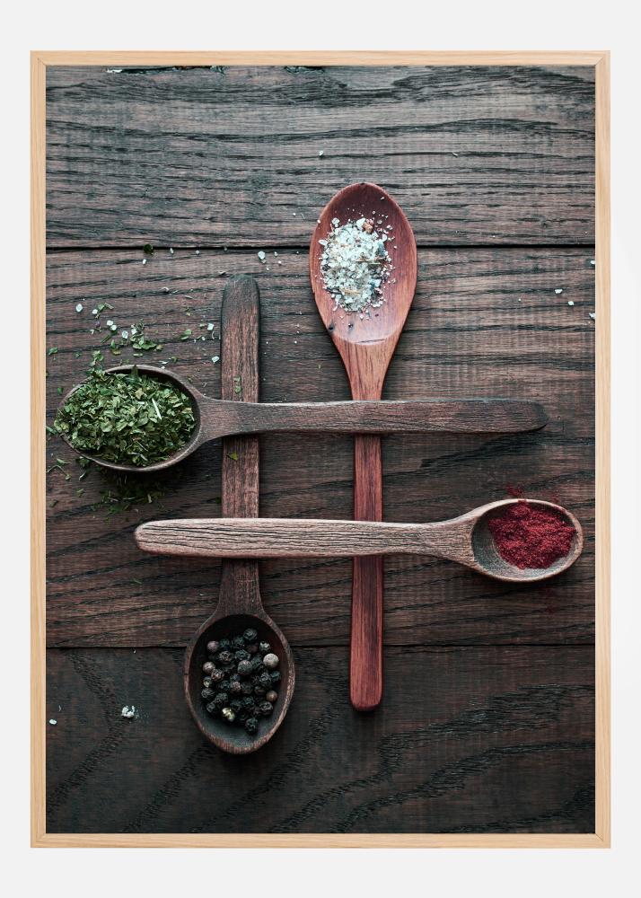 Mrtva priroda poster s četiri drvene žlice, od kojih svaka sadrži jedan začin. Četiri žlice križaju se i tvore mrežu na rustikalnom drvenom stolu. Bilje i začini prosuti su iz svake žlice i stvaraju zabavnu kulinarsku atmosferu, savršenu za vašu kuhinjsku inspiraciju.