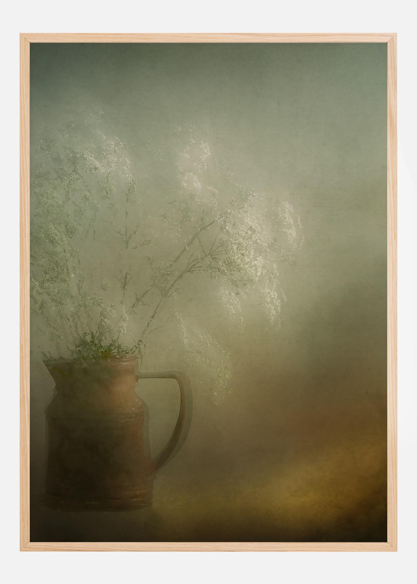 Oslikavajući plakat mrtve prirode s smeđim glinenim vrčem punim mekih lepršavih bijelih cvjetova. Ovaj proljetni buket je nalik oblaku i gotovo nestaje prema mekom sivom zidu iza. Narančasti sjaj daje toplinu pri dnu slike gdje stoji vrč.