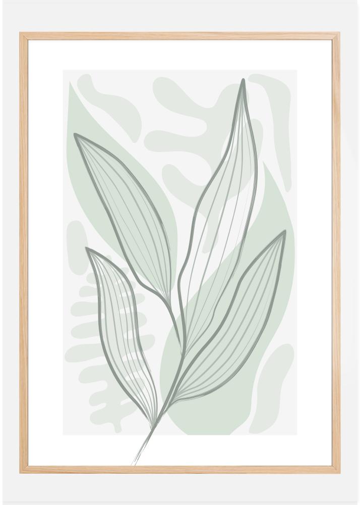 Abstraktni poster s listovima na jednostavnoj zelenoj pozadini s razliÄitim oblicima i uzorcima listova. S mekim zelenim i sivim bojama, jednostavan dizajn listova, omeÄen snažnom sivom linijom, pruža snažan, ali blag proljetni osjeÄaj koji se može objesiti u bilo kojoj sobi doma.