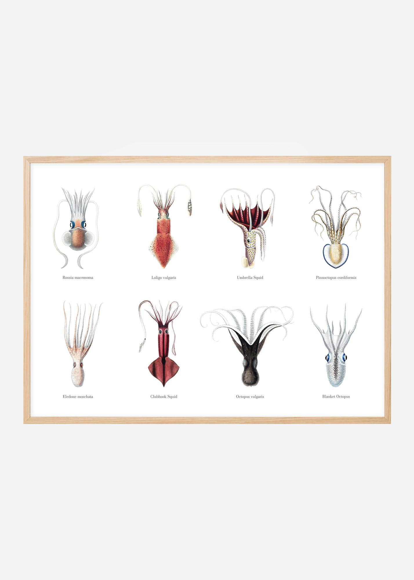 Hobotnica je doista zanimljivo stvorenje. Jeste li znali, na primjer, da ima 3 srca? Ili da je njezin inteligentni mozak majušan, unatoč tome što golemi objekt koji izgleda kao glava izgleda kao da sadrži ogroman mozak? Nadalje, postoji gotovo 800 vrsta hobotnica! Ovaj lijepi vintage poster prikazuje 8 od njih - nijedna nije kao druga, ali sve su jednako fascinantne. Stari crteži imaju slatke, dobro izrađene detalje, a ispod svake vrste stoji ime.
