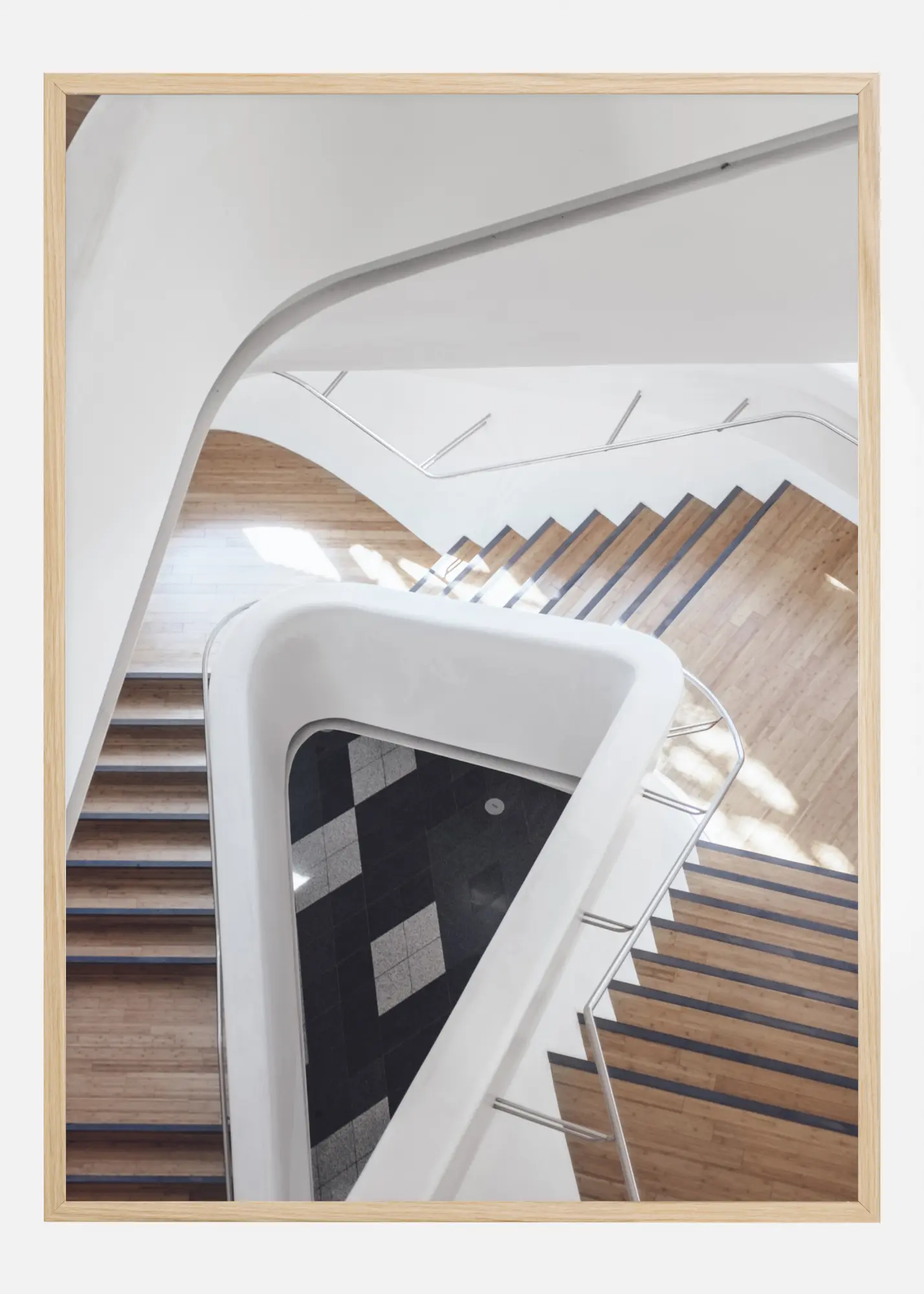 Plakat za interijer s nizom stepenica u trokutastom obliku. Stepenice su smeđe s bijelim zidovima i rukohvatima s kromiranim ogradama. Stepenice su okrugle i zavijaju prema crno-bijelom podu od keramičkih pločica dolje. Pogledajte dolje odozgo u ovoj slici sličnom Escheru i zamislite da hodate po ovim prekrasnim stepenicama.