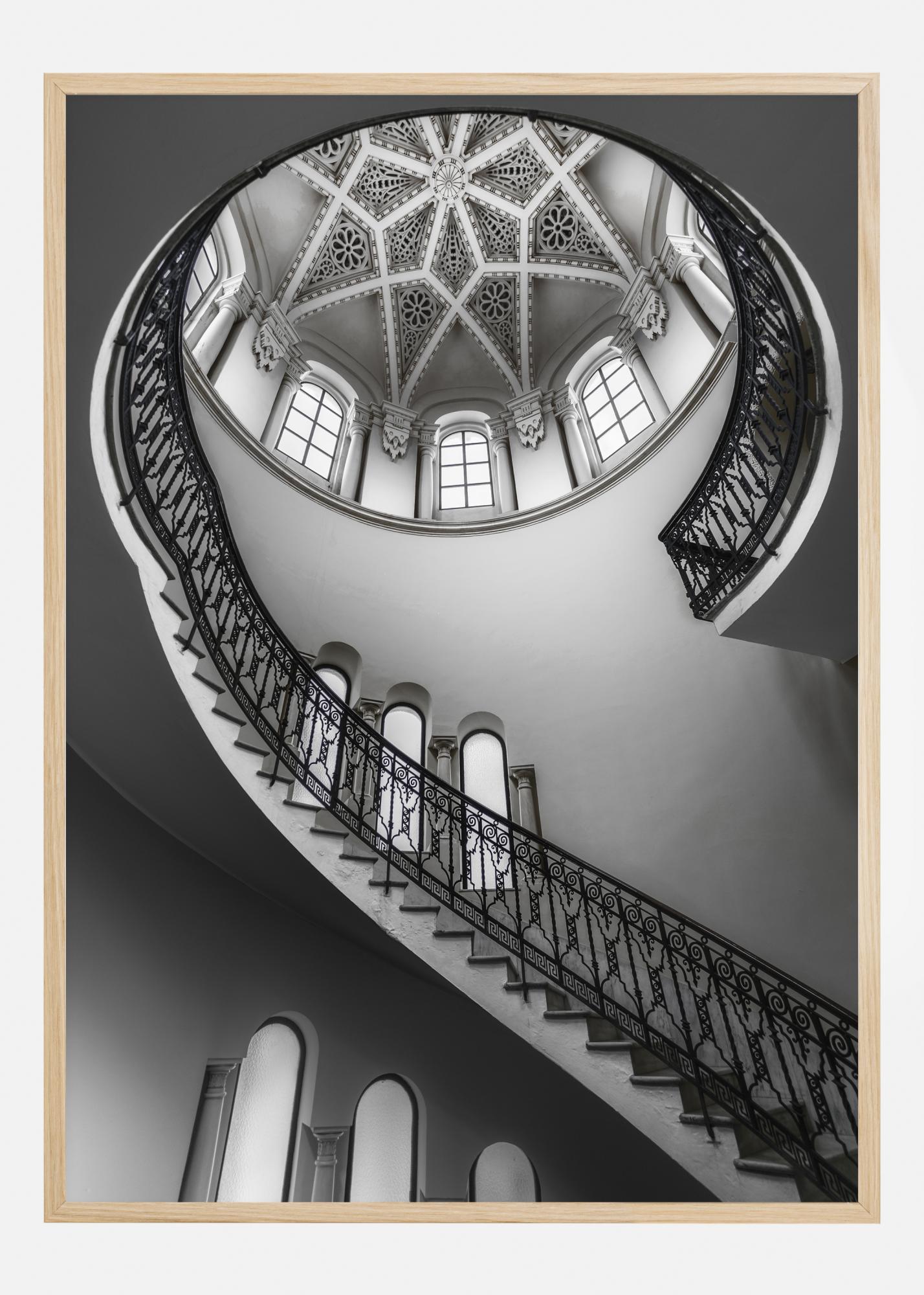 Kompleksan poster s unutrašnjosti zgrade. Spiralno stubište s intrikatnim šipkama od kovanog željeza uvija se prema stropu. Pogled se usmjerava prema kupoli s fantastičnim rešetkastim dizajnom i svijetlim prozorima kroz koje svjetlo ulazi. Elegancija i bogatstvo detalja kombiniraju se u ovoj crno-bijeloj slici.
