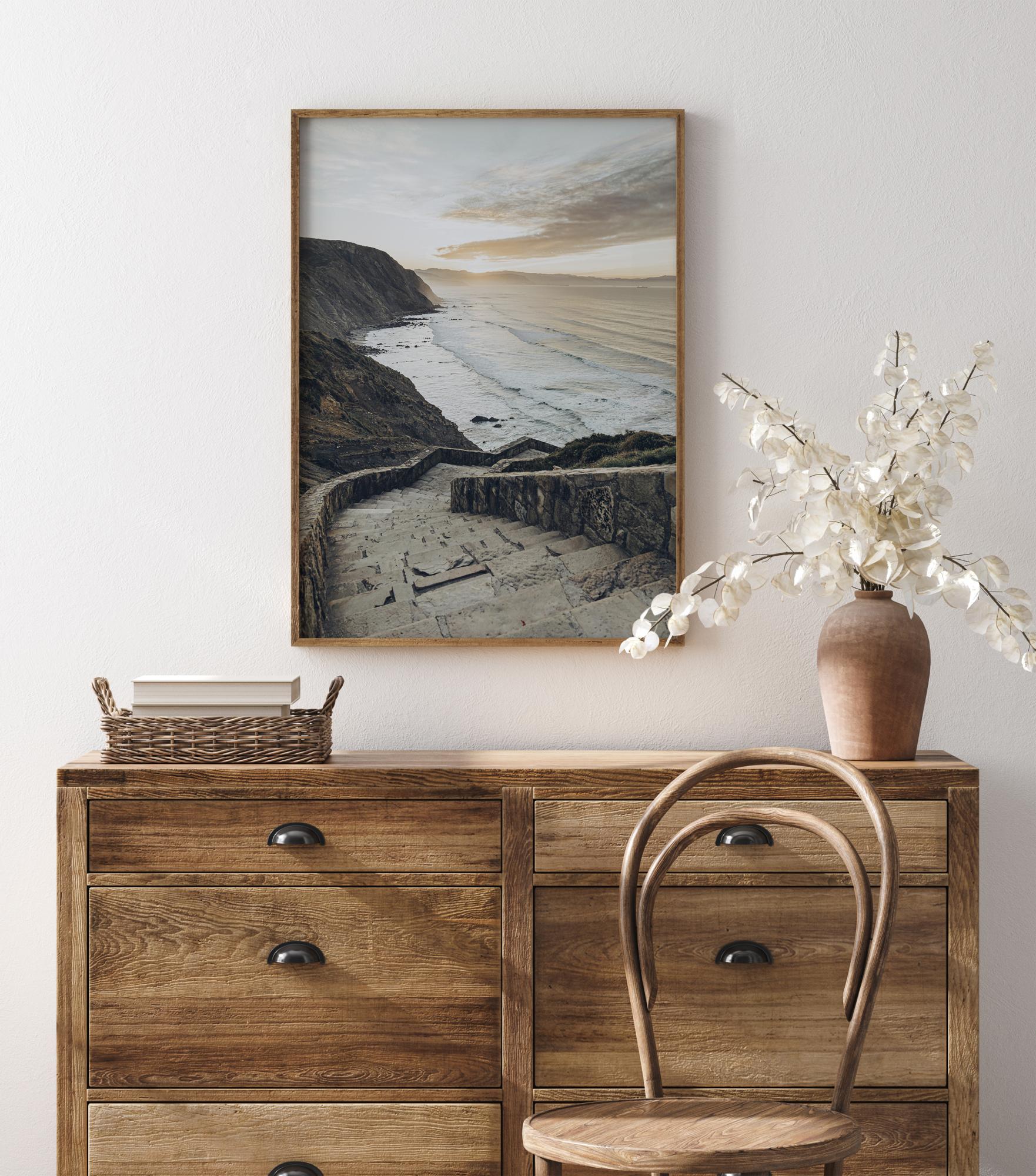 Prekrasan plakat krajolika s panoramskim pogledom na more i plažu. Velike kamene stepenice vode niz liticu prema plaži koja odražava oblik rta u daljini. Valovi udaraju o kamenitu plažu na ovoj mekoj, pastelnoj slici.
