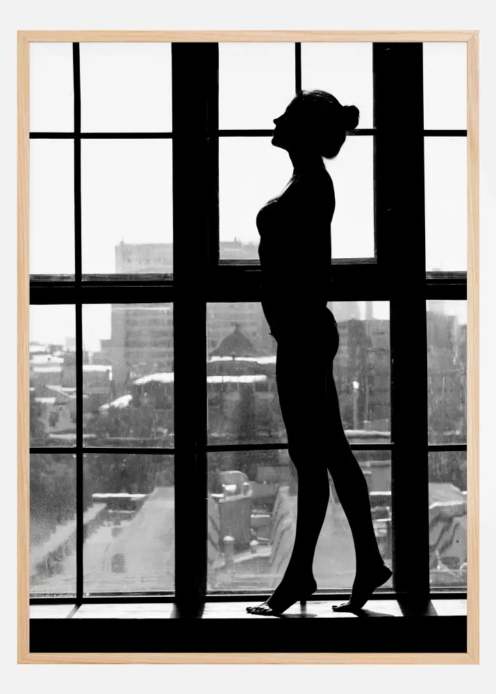 Fotografska umjetnost u sivim tonovima žene koja stoji na velikom industrijskom prozoru. Protusvjetlo čini ženu tamnom siluetom naspram grada izvana. Elegantan poster, savršen za kombiniranje s drugim favoritima na većem zidu s umjetničkim djelima.