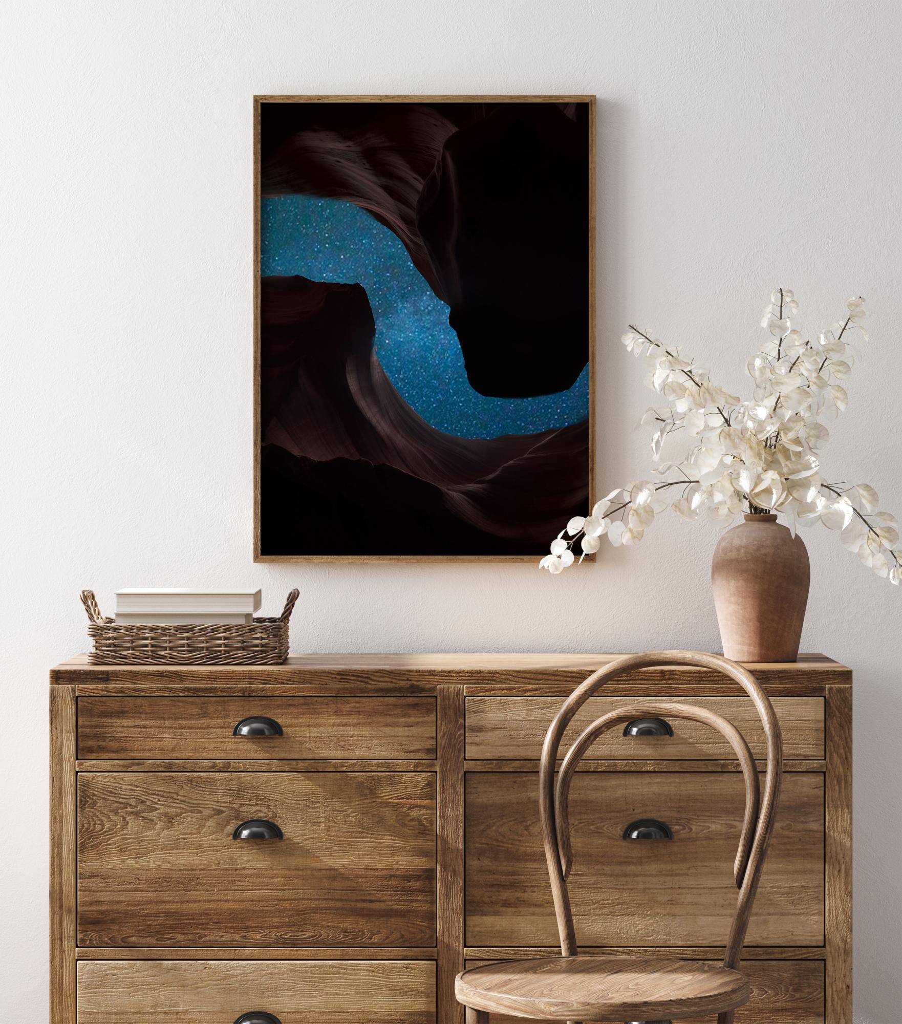 Veličanstveni noćni poster s zvjezdanim nebom koje proviruje između nekih dramatičnih formacija stijena. Tamnocrvene stijene kovitlaju se oko vrha i dna fotografije, stvarajući zvjezdanu stazu za noćno nebo da zasja kroz ovu živopisnu sliku stvorenu da izazove strahopoštovanje.