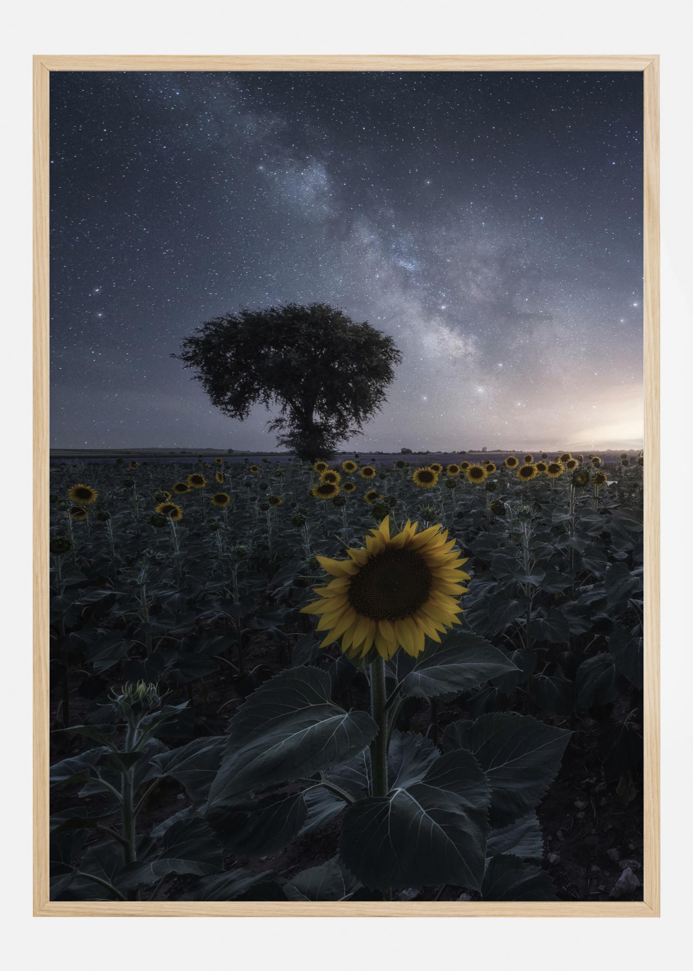 Plakat s cvjetnim motivom sa suncokretima noću. Polje suncokreta drži svijetlo žute cvjetove prema noćnom nebu. To se odražava na zalasku sunca u daljini koji i dalje osvjetljava cvjetove, ali također osvjetljava nebo tako da se mogu vidjeti zvijezde. Mistika obiluje u ovom prizoru.