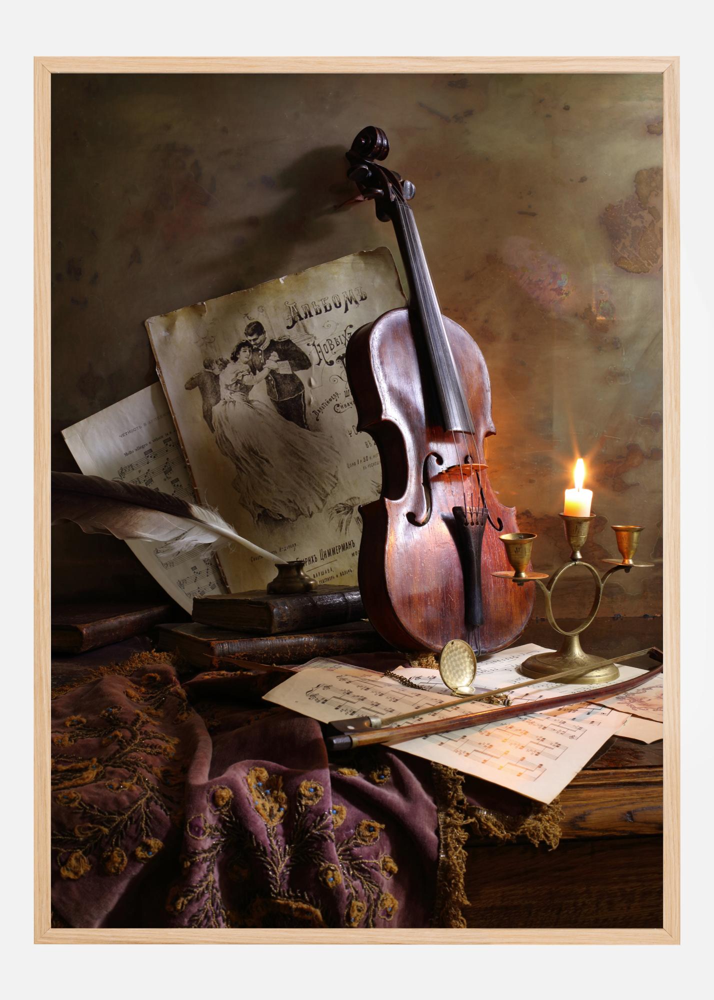 Plakat stillebena s violinom i notnim listovima. Blago svjetlo sjaji snažno i osvjetljava mahagonijsku boju violine dok stoji uz zid. Platno, notni listovi, pero, gudalo i drugi pribor ispunjavaju scenu i daju prostoriji topao i ispunjavajući osjećaj.