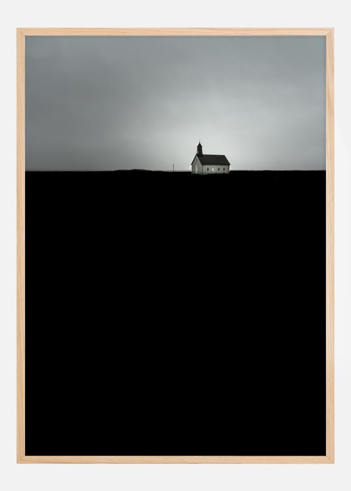 Ovaj poster daje snažnu i atmosferičnu sliku Strandarkirkje, usamljene crkve koja stoji naspram dramatičnog neba. Tamna silueta krajolika stvara oštar kontrast s sivim nebom, što pruža osjećaj izolacije i tišine. Bijeli zidovi crkve osvjetljavaju krajolik, nudeći simbol nade i vodstva u okolnoj tami.