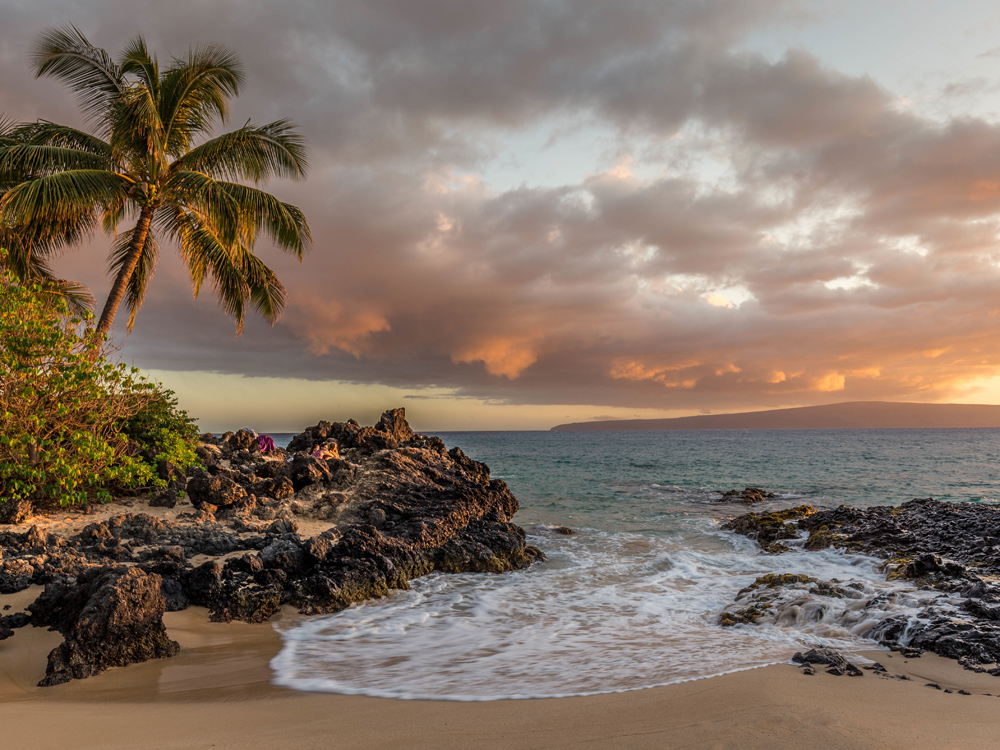 Jedna plaža u zalasku sunca, prekrasna klišej koja je neophodna za zaljubljenike u tiki ili tropskom temom. Poster s klasičnom palmom koja se naginje iznad obale na zadnjim zlatnim sunčevim zrakama dana. Fotografija izgleda lijepo u okviru sa starinskim izgledom ili u jakoj boji kako bi odgovarala tiki uređenju.