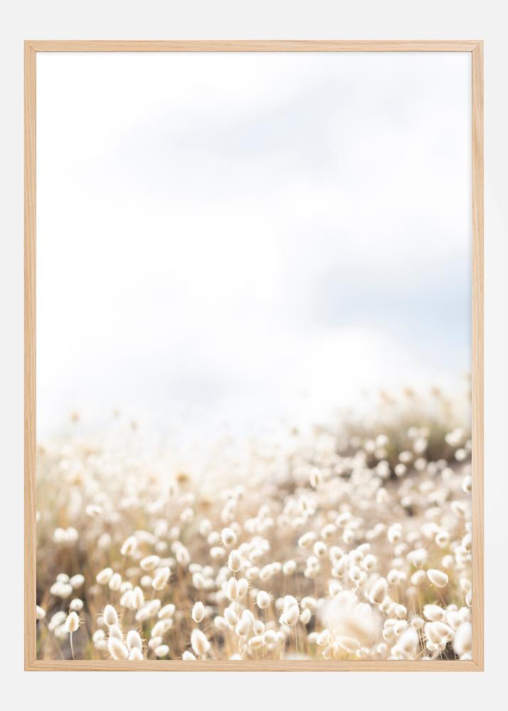 Ovaj sanjivi poster hvata polje puno laganog, pahuljastog cvijeća koje se kupa u nježnoj sunčevoj svjetlosti. Motiv, ispunjen prirodom i spokojem, prenosi osjećaj topline i mira. Bijele glavice cvijeća nježno klimaju na tihom povjetarcu, a slika je obavijena pastelnim tonovima žute, bež i bijele koji se stapaju s vedrim plavim nebom.