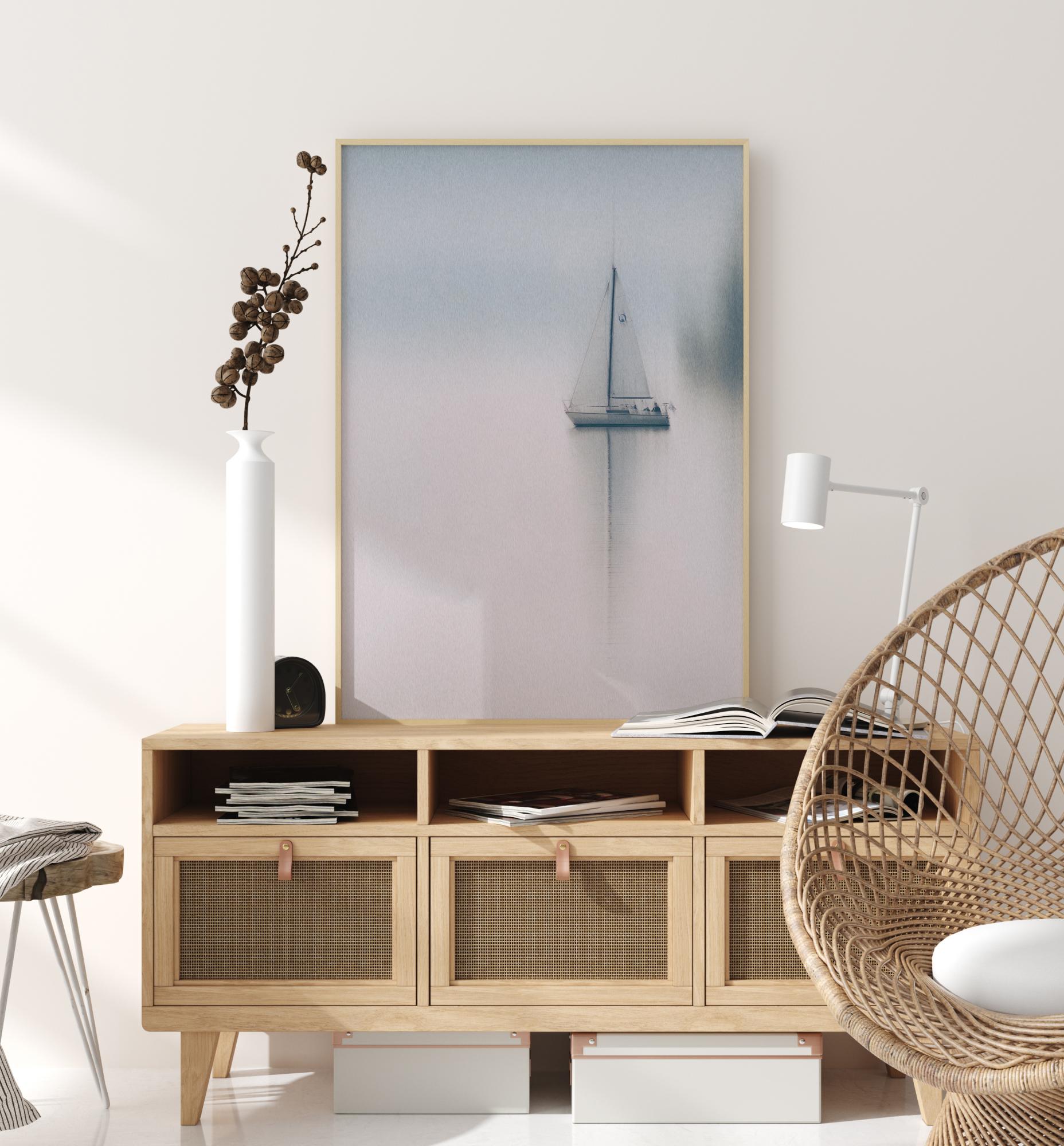 Umirujući poster jahte usred bijelog jezera. Slika je nježna s mutnim rubovima na svim figurama. Jedro broda je izduženo na vodi dok klizi u svijetloplavoj i sivoj magli jednog ranog nedjeljnog jutra.