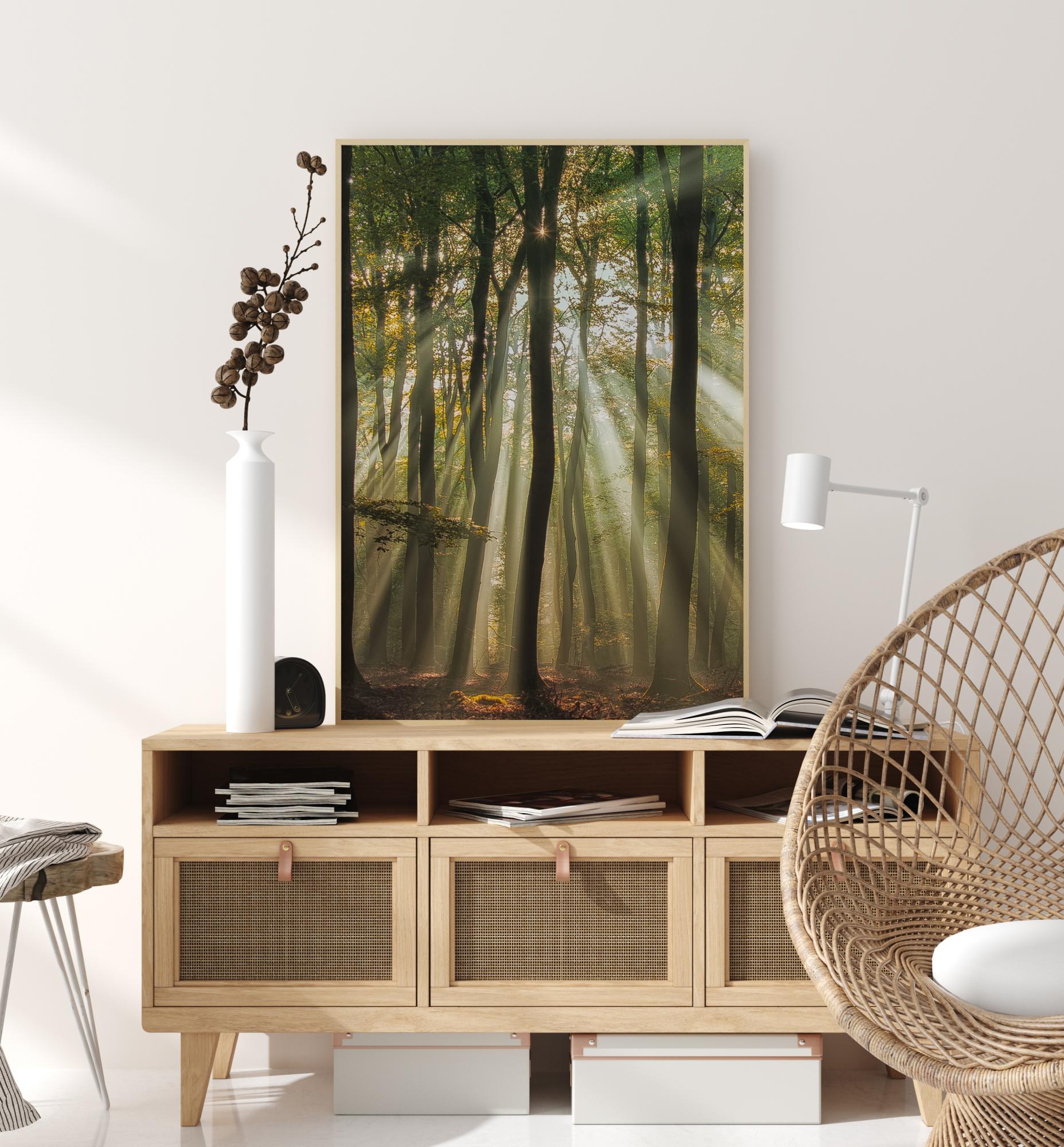 Plakat šume sa sunčevim zrakama koje padaju između visokih stabala. Duga stabla privlače pogled prema gore kroz sliku. Poput zvijezde, sunce svijetli na vrhu kroz otvor i baca mekane zrake kroz drveće, osvjetljavajući šumu mekim zelenim sjajem. Zamislite šetnju mirnom šumom.