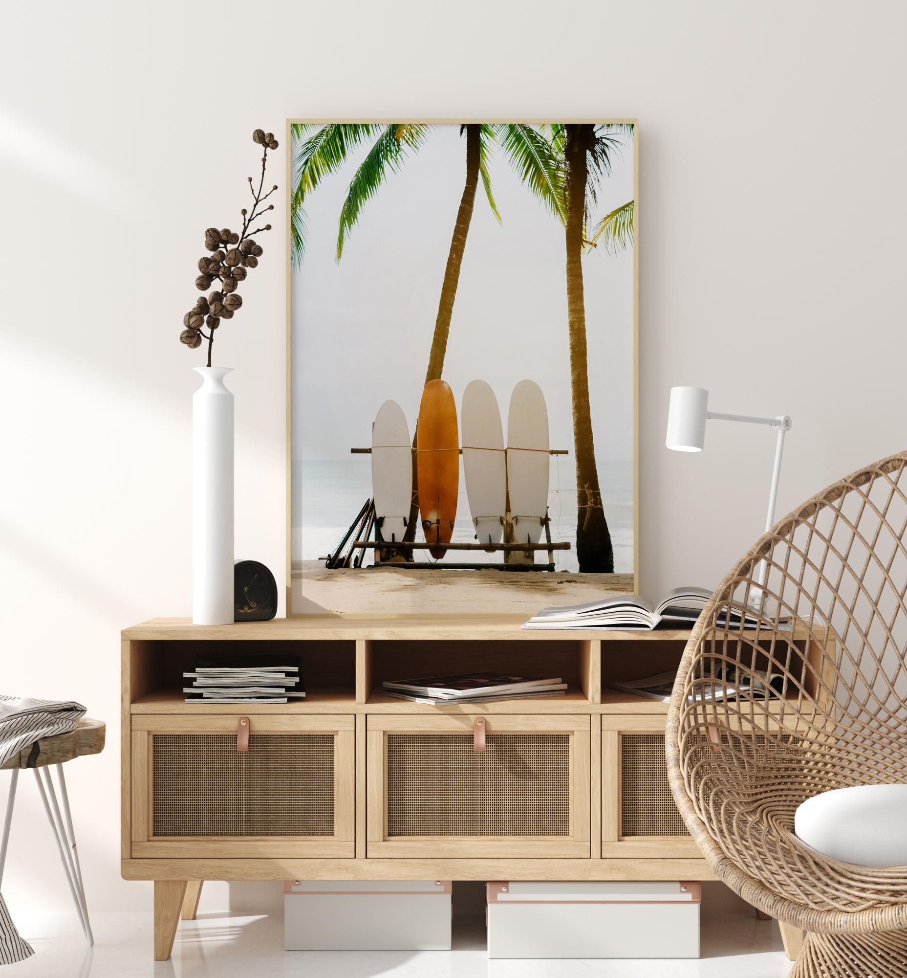 Jedan ljetni feel good poster s daskama za surfanje, palmama i bijelim pijeskom. Prekrasan egzotični motiv u ugodnim bojama i lijepim kontrastima. Rado ga kombinirajte s drugim našim prekrasnim motivima za veću, živopisniju zidnu galeriju.
