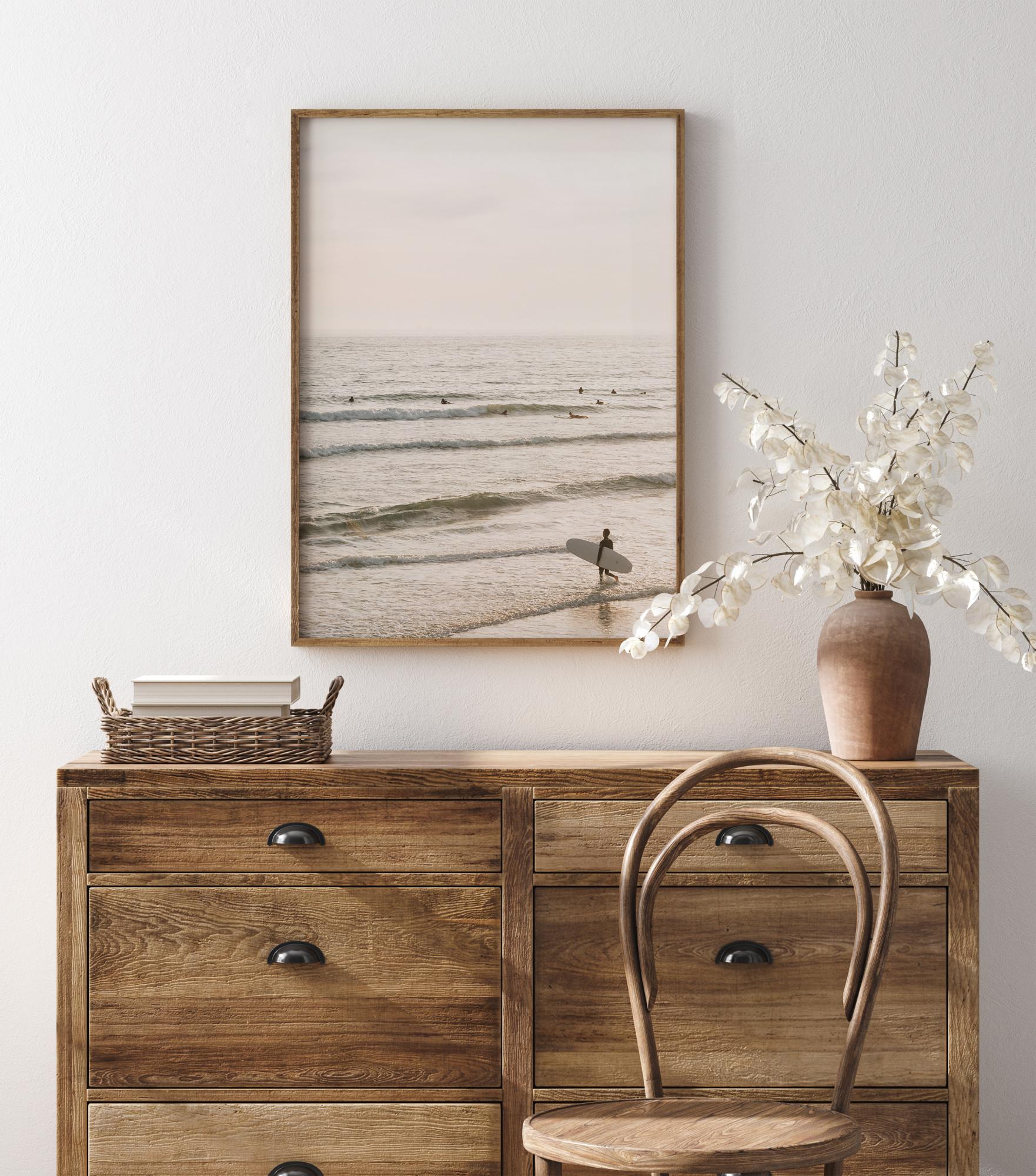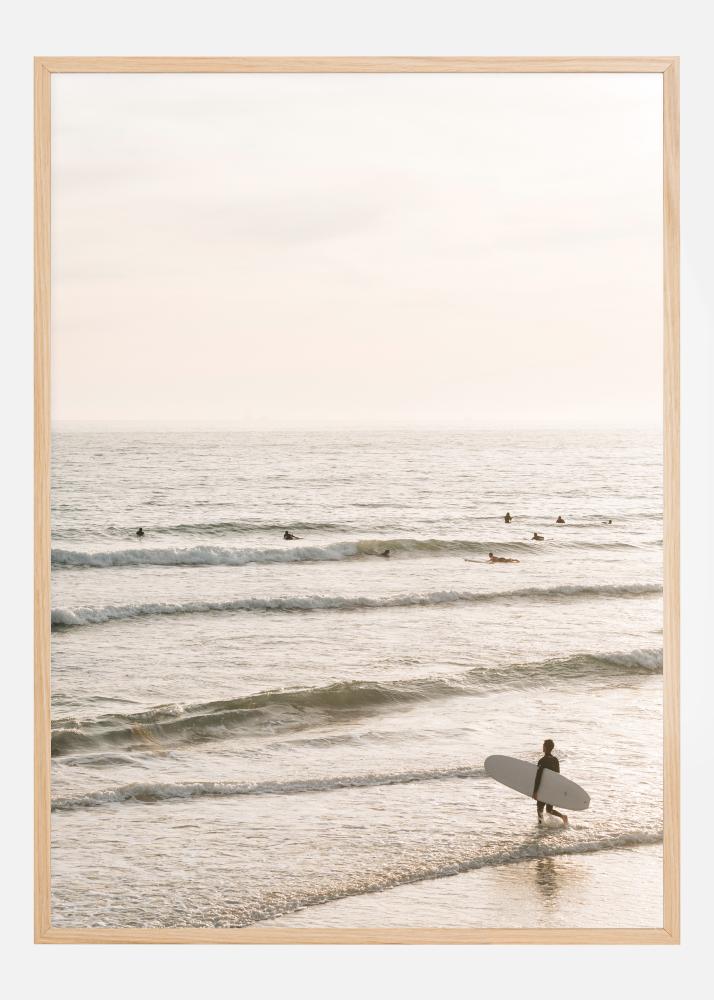 Poster s prostranim morem ispunjenim surferima koji čekaju sljedeći veliki val. Male glave ljuljaju se daleko u moru, a posljednji surfer hoda među valovima sa svojom daskom. More je mirno u nježnoj jutarnjoj svjetlosti i u zraku se osjeća očekivanje.