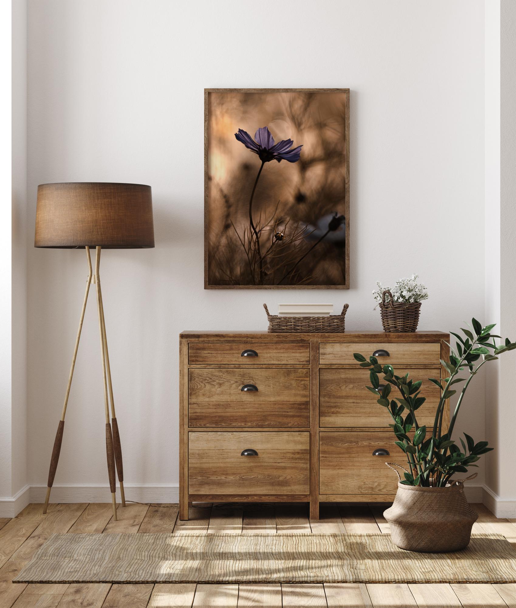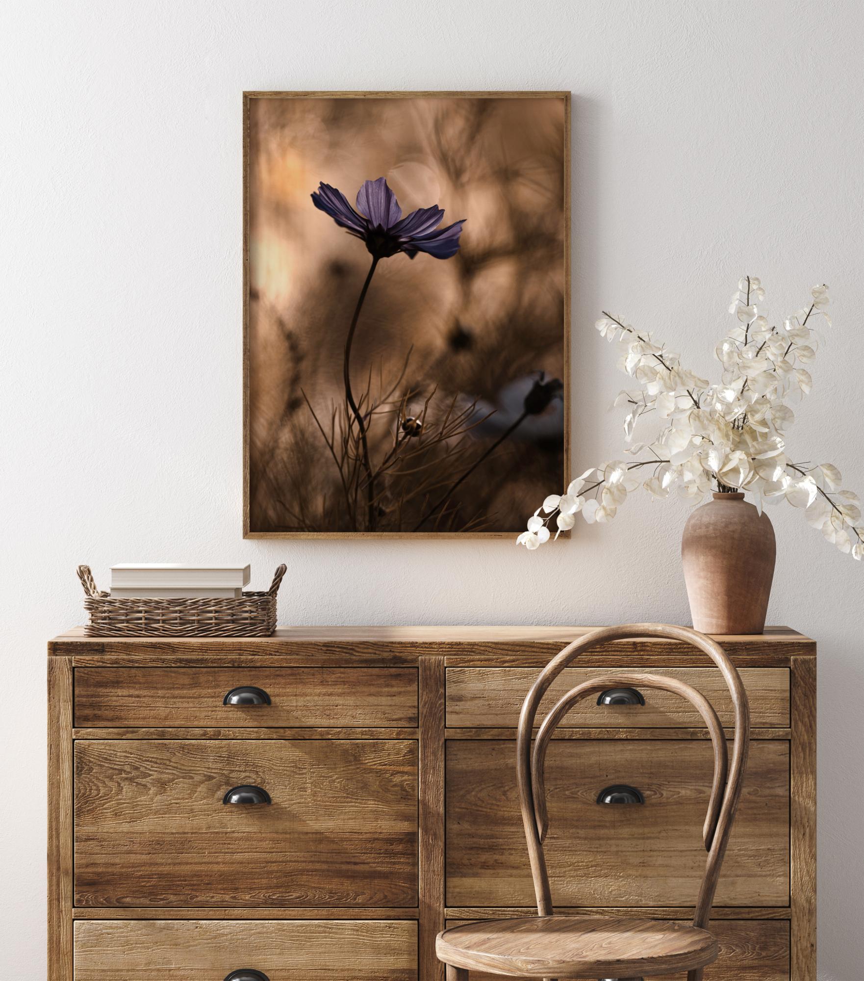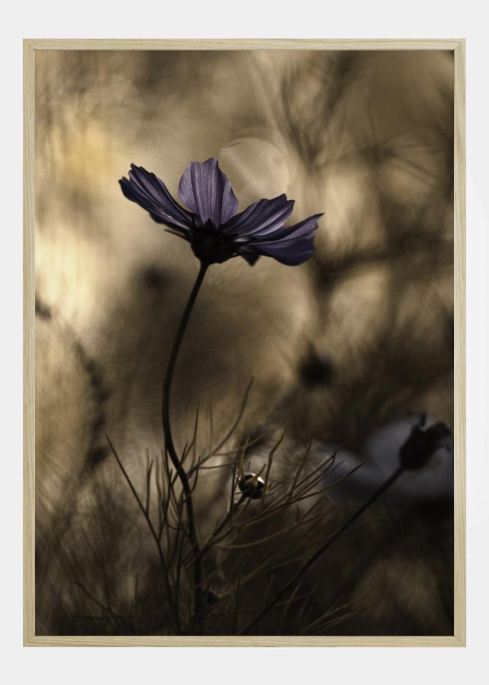 Plakat s cvijetom s nježno ljubičastim cvijetom koji se njiše prema mekoj smeđoj pozadini. Ljubičaste latice dramatično su istaknute naspram neoštrih biljaka u pozadini. Ostali oblici mogu se vidjeti dok pogled klizi duž zakrivljenih stabljika kako bi se sagledala cijela slika.