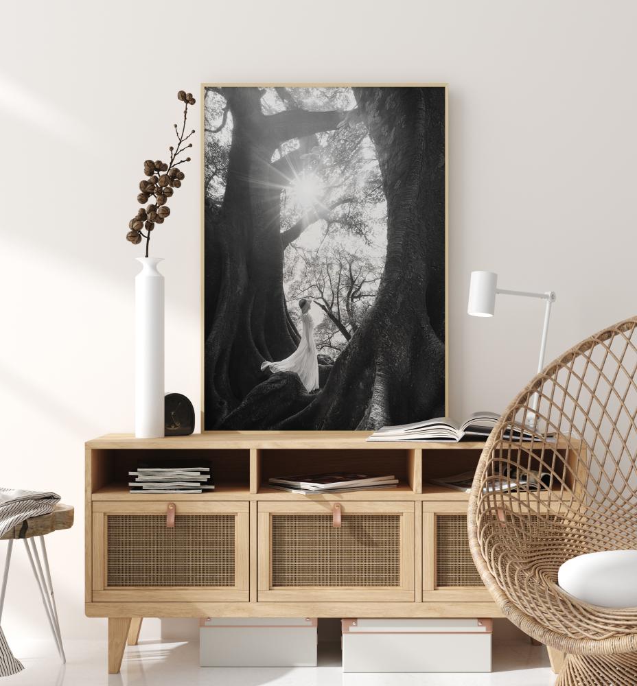 Prekrasan poster prirode s ogromnim drvećem, sunčevom zrakom i ženom koja stoji između. Svjetlosna zraka vas uvlači u ovu tajanstvenu fotografiju. Dajte svom domu osjećaj mira i spokoja uz pomoć ove slike.