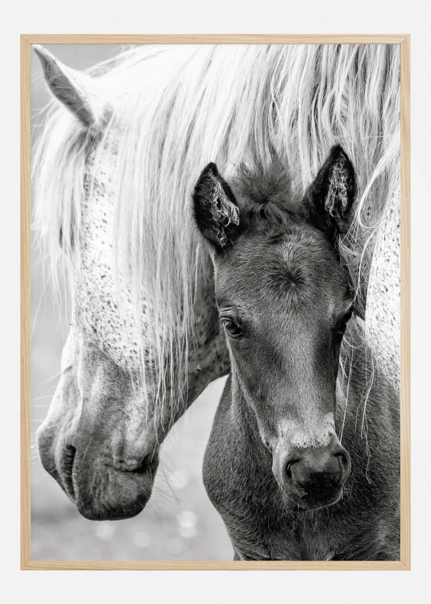 Poster sa životinjama s kobilom i njezinim ždrijebetom. Kobila štiti svoje ždrijebe i naginje svoju bijelu glavu preko njegovih leđa. Tamno obojeno ždrijebe gleda prema kameri iz tog zaklona, s ušima usmjerenim u znatiželji. Uživajte u ovoj slatkoj slici bebe.