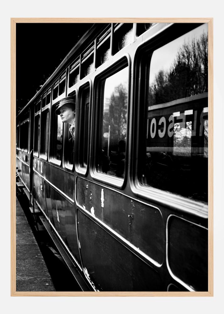 Ovaj sugestivni crno-bijeli poster hvata nostalgičnu trenutnu sliku osobe koja gleda kroz prozor vlaka. Osoba, odjevena u klasični šešir, daje slici bezvremenski osjećaj, dok refleksije i kontrasti stvaraju dramatičnu i emocionalnu atmosferu. Ogledna površina vlaka i tamni obrisi pridonose osjećaju pokreta i promjene.