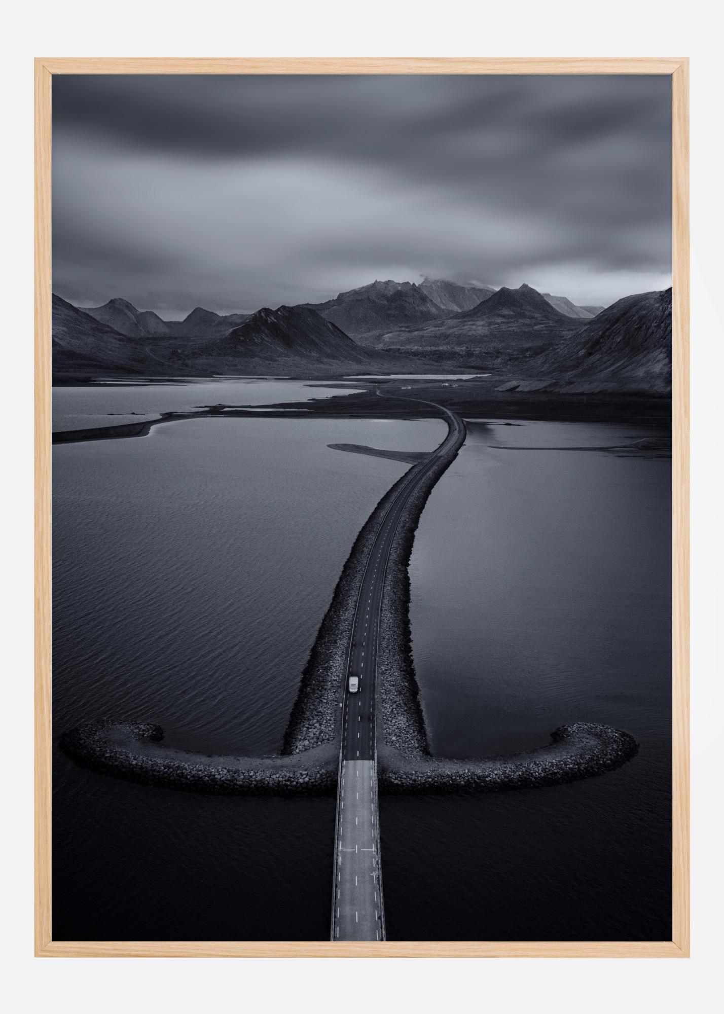 Poster u sivim tonovima s širokim putem koji prolazi kroz jezera i ulazi među planine u pozadini. Sivo oblačno nebo visi iznad. Jedan bijeli automobil putuje cestom prema daljini. Kombinirajte s laganim zidom kako biste dodali malo boje ovoj strogoj slici.