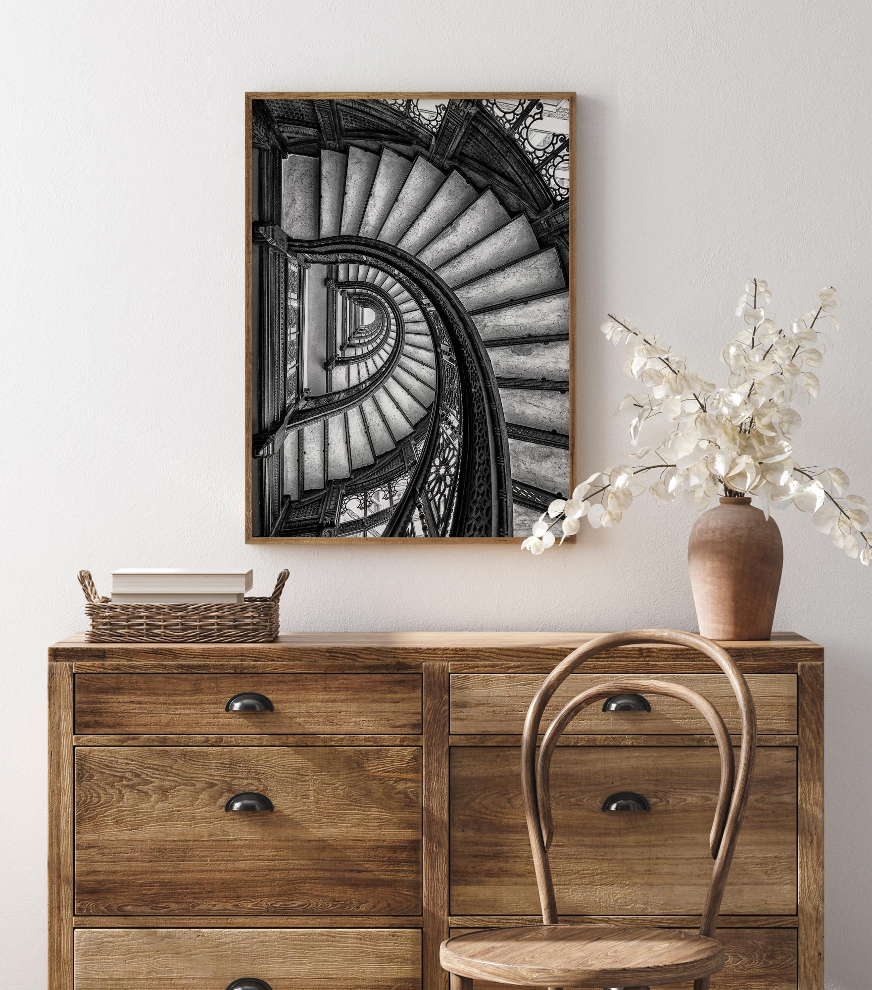 Unutarnji poster s nizom spiralnih stepenica koje se spuštaju do dna zgrade. Gledano odozgo, stepenice se vrte. Ograde od kovarskog željeza su detaljne i ističu se u odnosu na jednostavne stepenice. Kontrastni tonovi daju djelu dubinu dok pogled privlači prema dolje do dna.