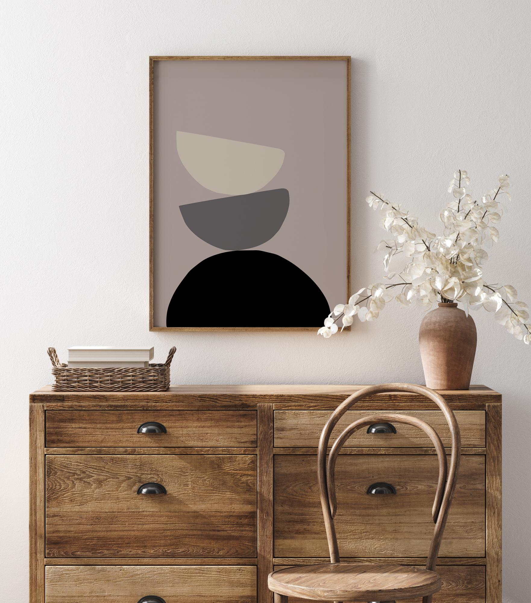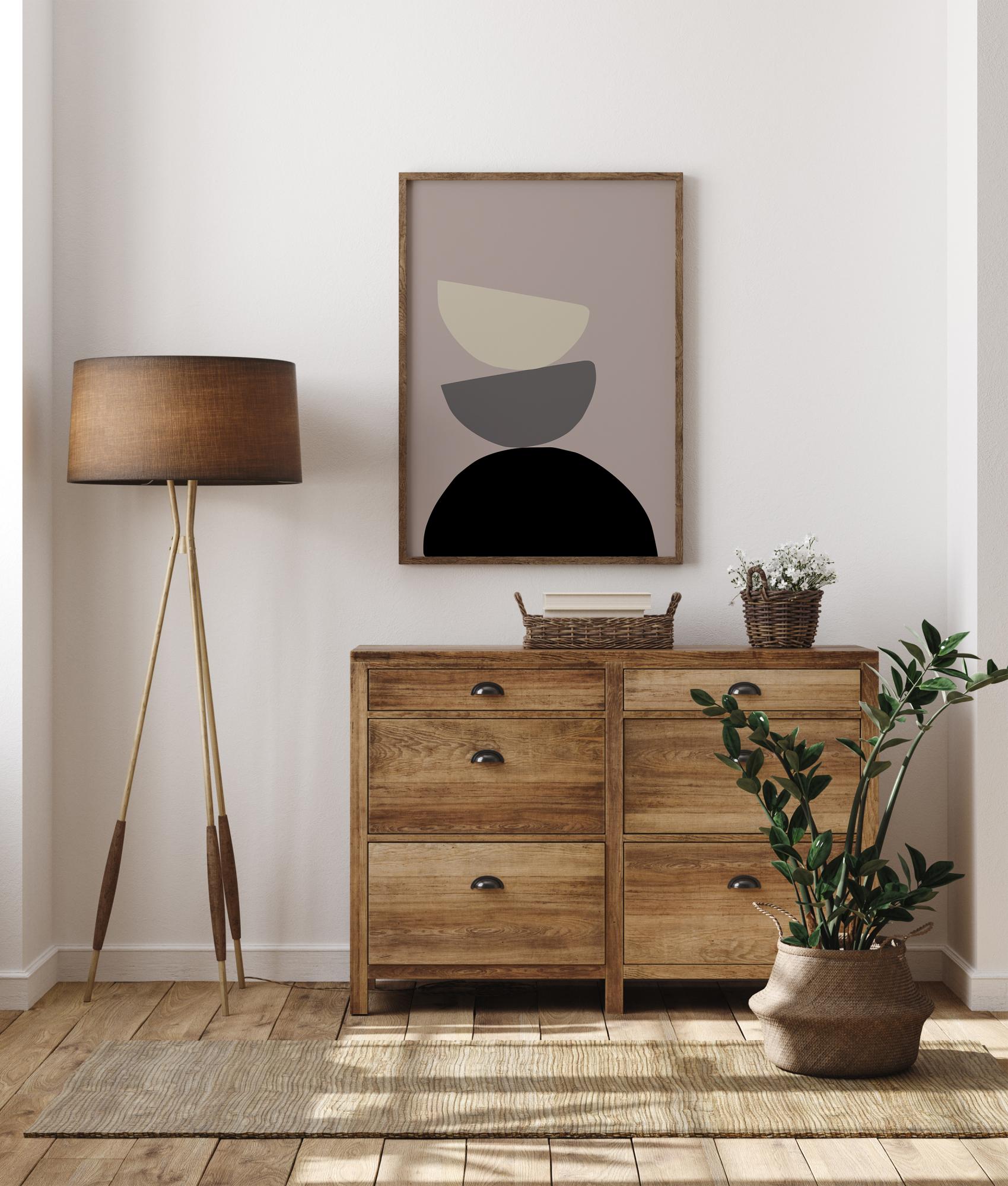 Apstraktni poster s tri polukruga naslagana jedan na drugi na sivoj pozadini. Veliki crni polukrug nalazi se na dnu, srednje sivi polukrug balansira na vrhu dok u isto vrijeme balansira bijeli polukrug višlje. Daje hladnu atmosferu na plavom zidu ili topliju atmosferu na bež ili kremastoj podlozi.