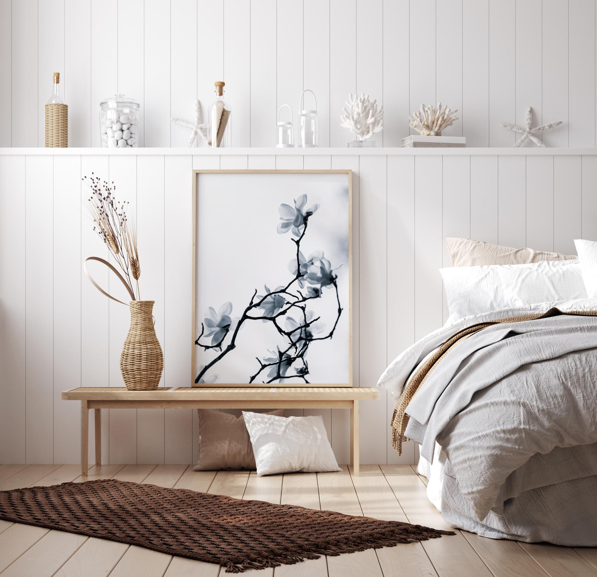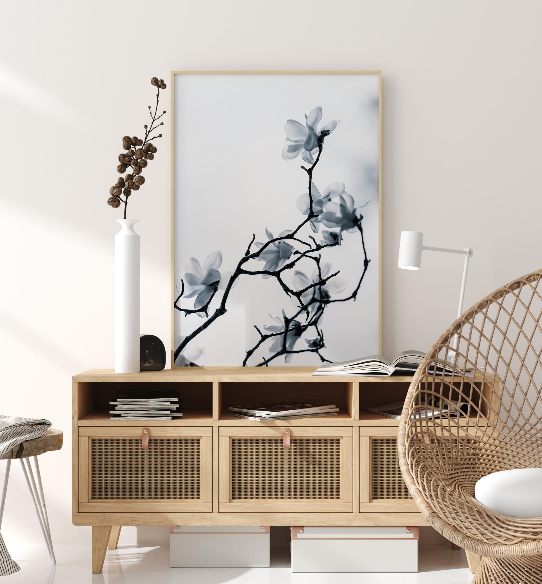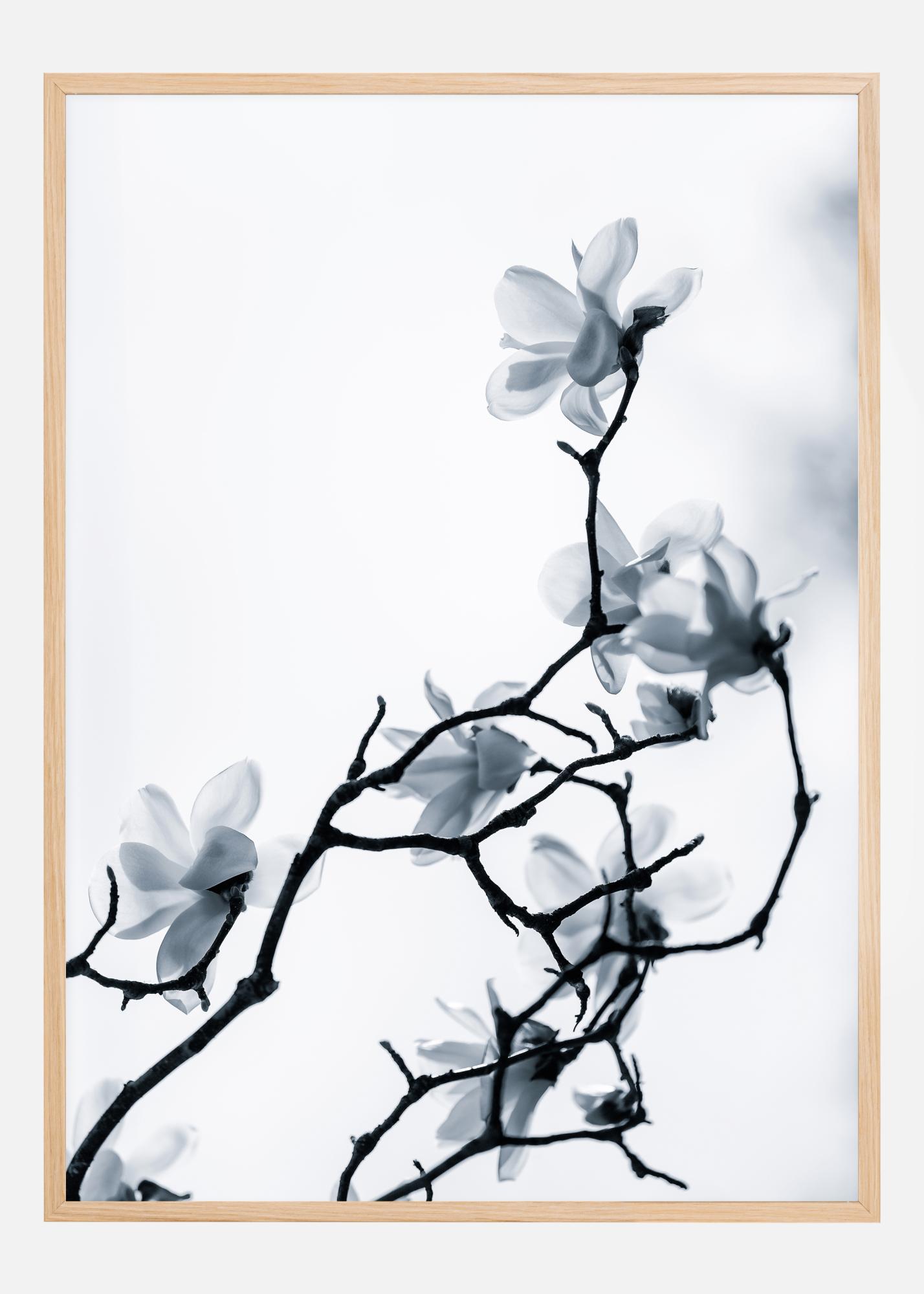Poster s cvjetnim motivom s gracioznom granom punom nježnih cvjetova. Tanke grane su crne na bijelom nebu i pružaju se prema gore, svaka nosi nježan bijeli cvijet. Smirenost i tišina zrače iz ove slike, koja bi se sjajno uklopila kao dodatak kupaonici ili jednostavnom zidnom hodniku.