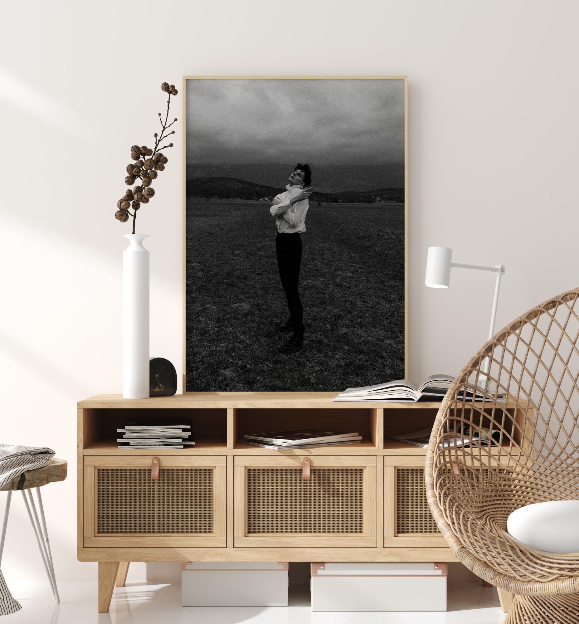 Portretni poster bezbrižnog muškarca usred otvorenog polja. Suptilne crne i bijele nijanse daju prirodan osjećaj. Uživajte u ovom privatnom trenutku zauvijek uhvaćenom kada ga objesite kod kuće.