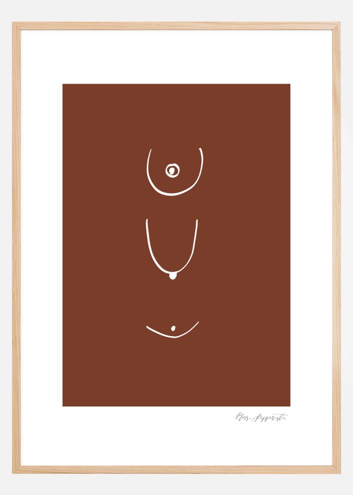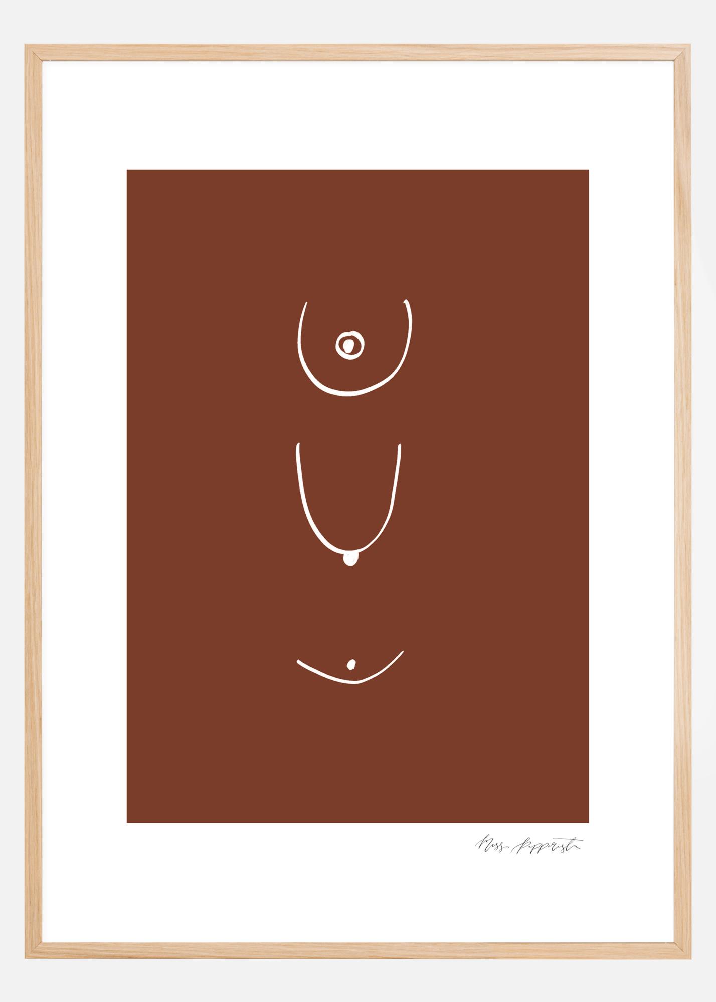 Apstraktni poster s bijelim zakrivljenim linijama i točkama na jednostavnoj smeđoj pozadini. Linije se mogu tumačiti kako želite, ali izgledaju kao ženske grudi oslikane iz različitih kutova. Uživajte u pomalo čudnom karakteru ove jednostavne slike.
