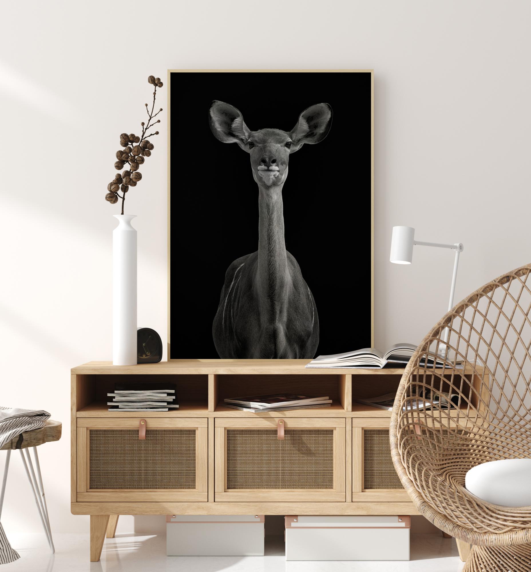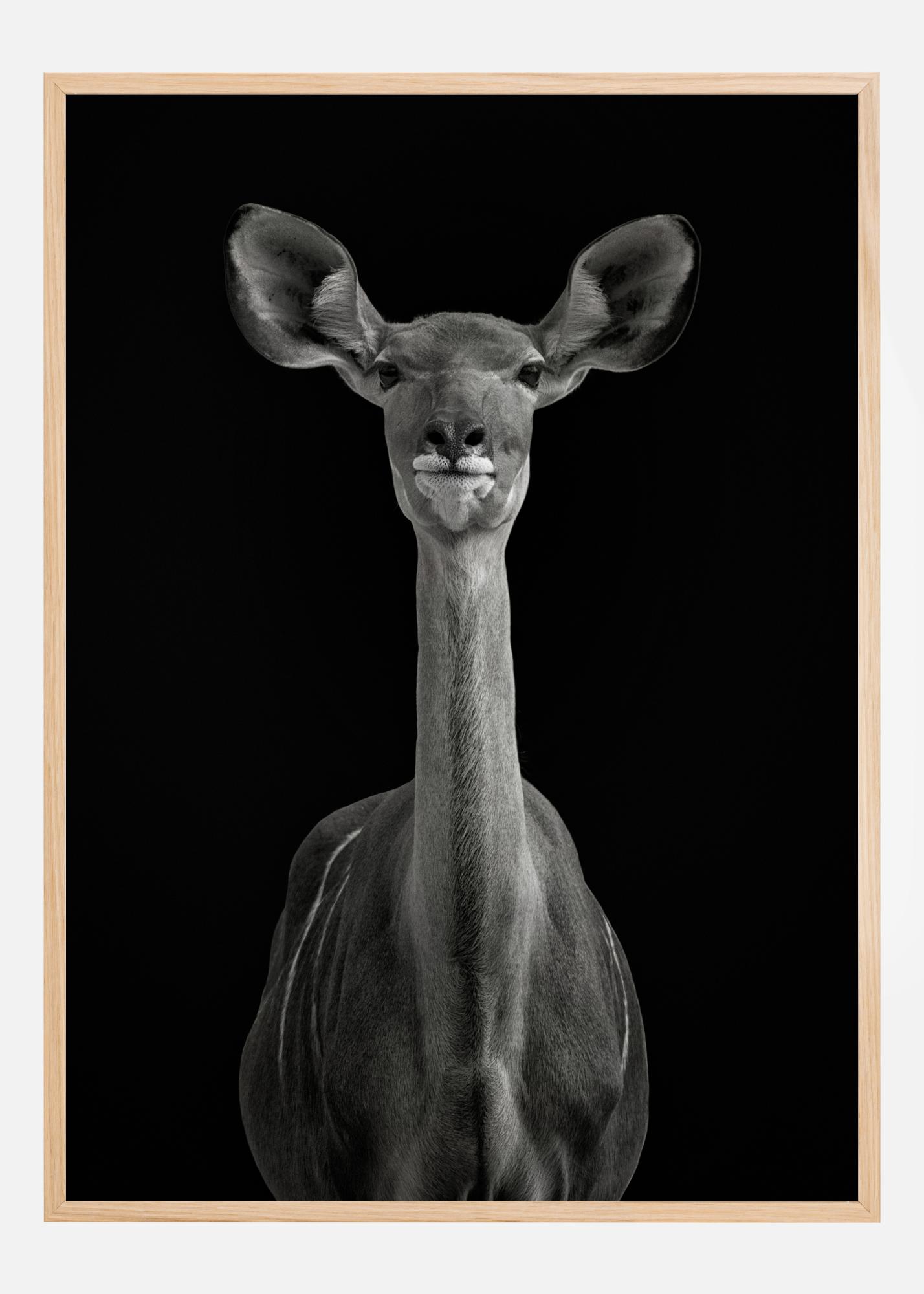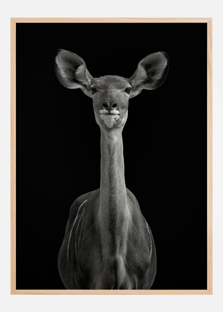 Prekrasan portret antilope na duboko crnoj pozadini. Antilopa se okreće prema kameri, s ušima usmjerenima naprijed dok gleda i sluša. Njezin vrat je dug i vitak, a oči su joj nježne. Kombinirajte s drugim otiskom životinje za stvaranje fantastičnog zoološkog osjećaja.