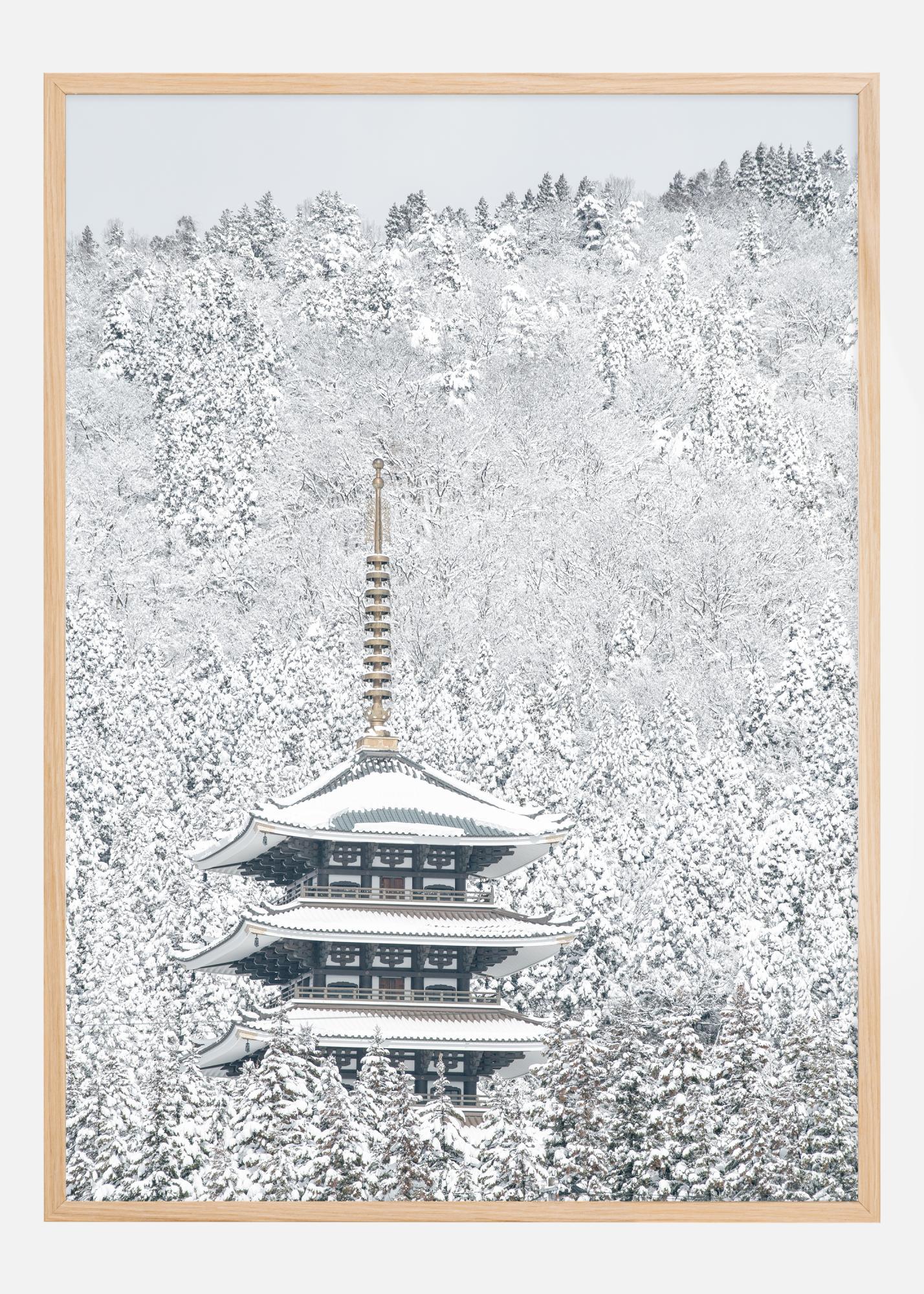 Ovaj atmosferični poster priziva miran osjećaj zimskog krajolika, gdje tradicionalna istočnoazijska pagoda stoji veličanstveno okružena morem drveća prekrivenog snijegom. Suptilni kontrast između delikatne arhitekture i snažnih, bujnih stabala, sve umotane u debeli sloj snijega, stvara sliku tišine i izolacije. Ovaj print savršeno hvata usamljenost ljepote zimske prirode, gdje nijanse bijele variraju od jakog, svijetlog svjetla do mekanih, prigušenih tonova.