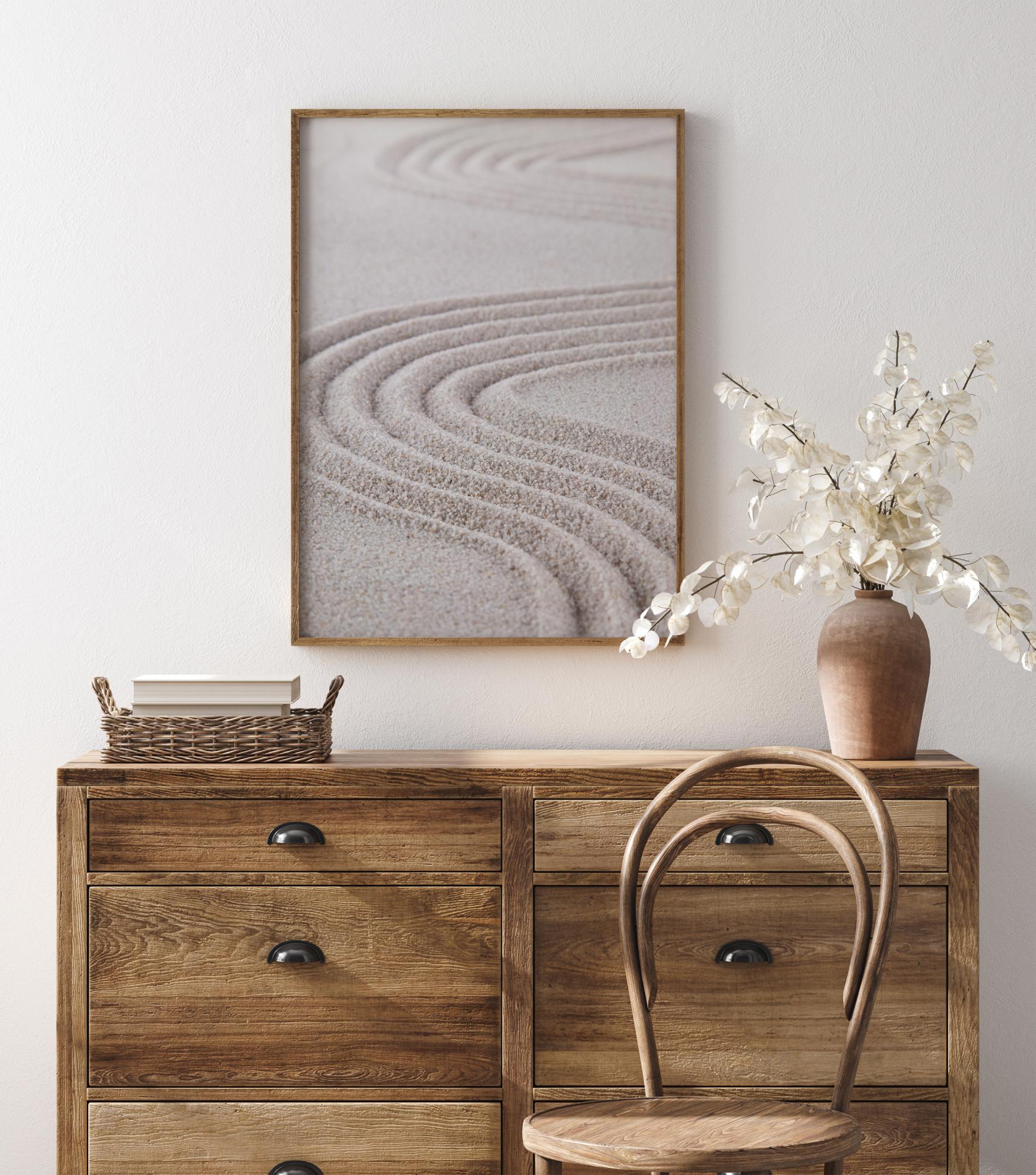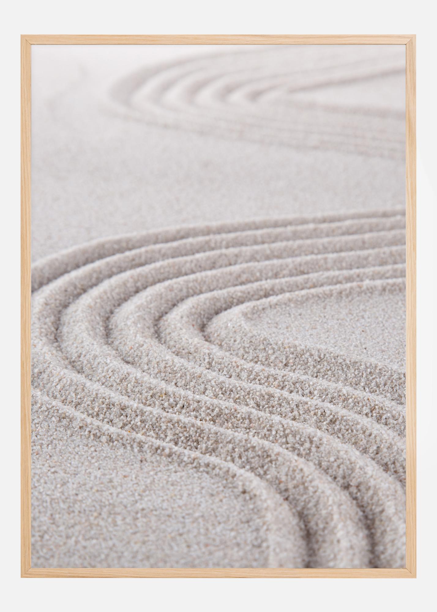 Poster izbliza s linijama koje su izvučene u pijesku. Grabljama su stvoreni vrtlozi u pijesku, linije su jednako razmaknute kako bi se stvorili duboki žljebovi. Zahvaljujući izblizanom prikazu, možete vidjeti zrnca u zabavnom vrtložnom uzorku. Kombinirajte s bež zidom kako biste unijeli pješčanu boju u sliku.